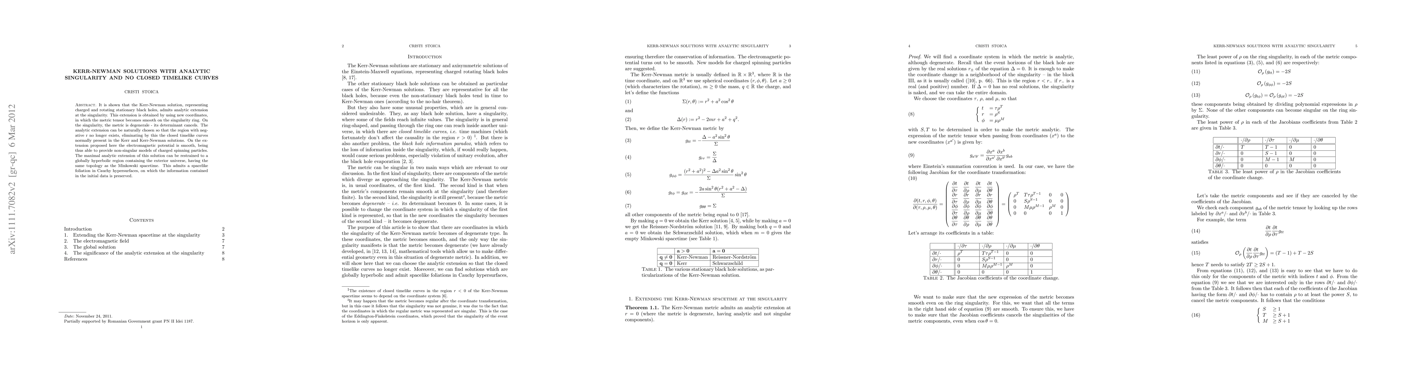 This paper demonstrates that the Kerr-Newman solution, representing charged and rotating black holes, can be analytically extended beyond its singularity using new coordinates, eliminating closed timelike curves and providing non-singular models of charged spinning particles. The maximal extension preserves information in the initial data and maintains the same topology as Minkowski spacetime.