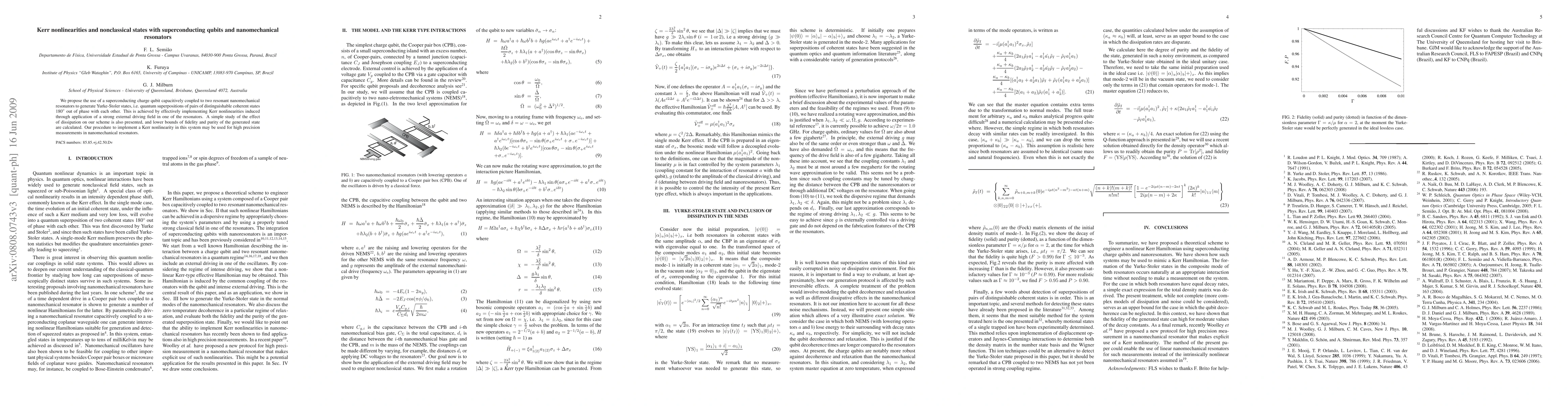 This paper proposes a method to generate Yurke-Stoler states using a superconducting charge qubit coupled to two nanomechanical resonators, leveraging Kerr nonlinearities induced by a strong external driving field. The study also examines the impact of dissipation and calculates lower bounds for fidelity and purity of the generated states.