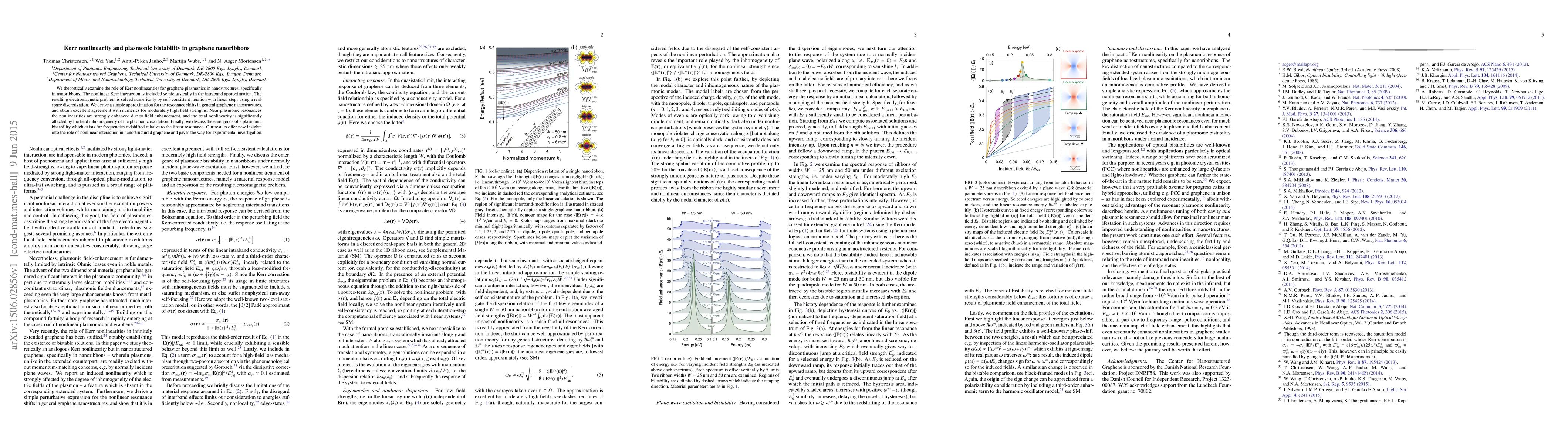 This paper investigates Kerr nonlinearities in graphene nanoribbons, demonstrating strong enhancement near plasmonic resonances and deriving a model for resonance shifts. The study reveals plasmonic bistability at redshifted frequencies, offering insights into nonlinear interactions in nanostructured graphene.