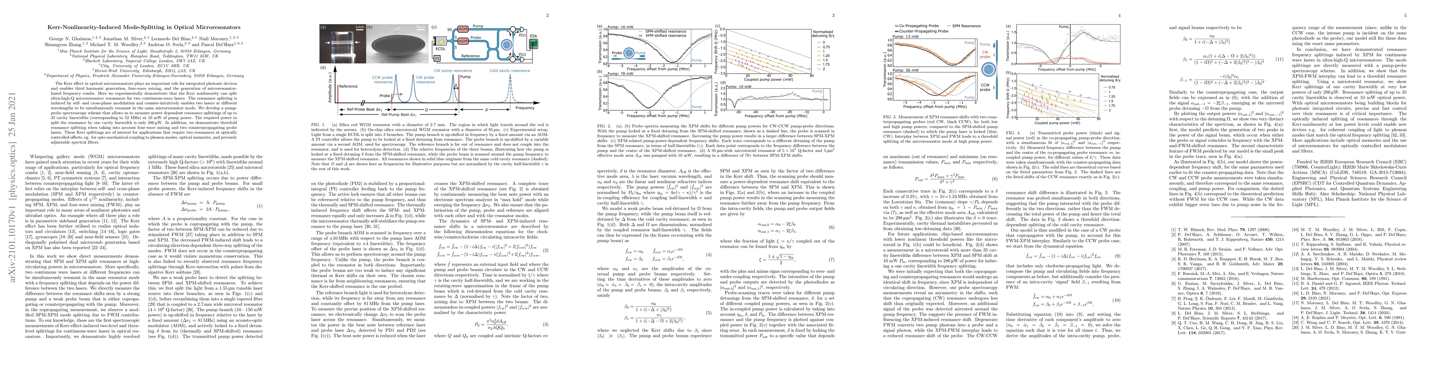 This paper demonstrates Kerr nonlinearity-induced mode-splitting in optical microresonators, enabling two continuous-wave lasers to be simultaneously resonant within the same mode. The study shows resonance splittings up to 35 cavity linewidths at 10 mW pump power, with minimal required power of 286 µW per linewidth, and explores applications in opto-mechanical coupling, optical memories, and spectral filters.