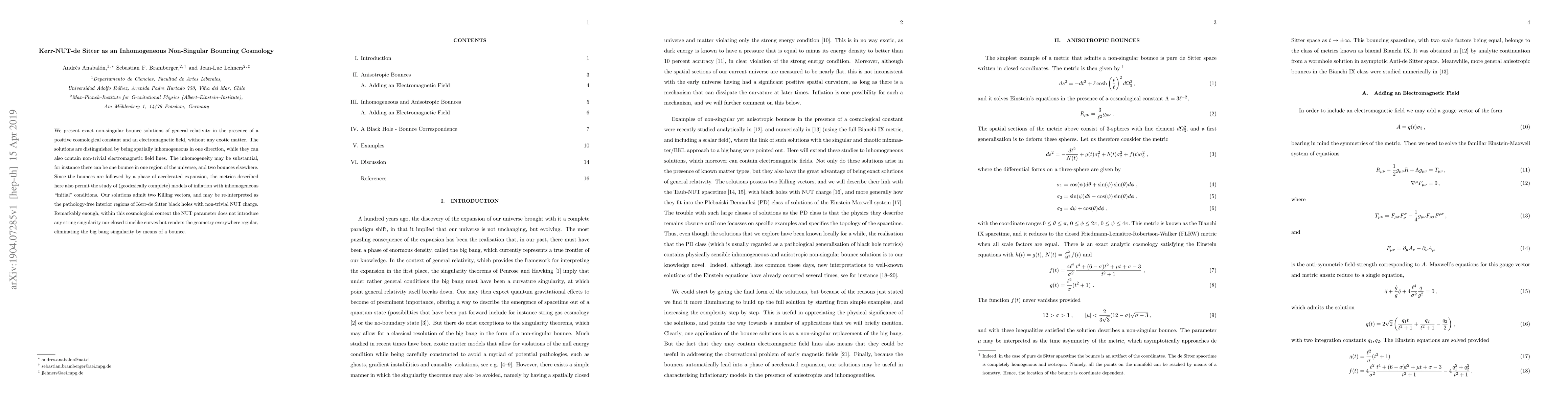 We present exact non-singular bounce solutions of general relativity in the presence of a positive cosmological constant and an electromagnetic field, without any exotic matter. The solutions are distinguished by being spatially inhomogeneous in one direction, while they can also contain non-trivial electromagnetic field lines. The inhomogeneity may be substantial, for instance, there can be one bounce in one region of the universe and two bounces elsewhere. Since the bounces are followed by a phase of accelerated expansion, the metrics described here also permit the study of (geodesically complete) models of inflation with inhomogeneous initial conditions. Our solutions admit two Killing vectors and may be re-interpreted as the pathology-free interior regions of Kerr-de Sitter black holes with non-trivial NUT charge. Remarkably enough, within this cosmological context, the NUT parameter does not introduce any string singularity nor closed timelike curves but renders the geometry everywhere regular, eliminating the big bang singularity by means of a bounce.