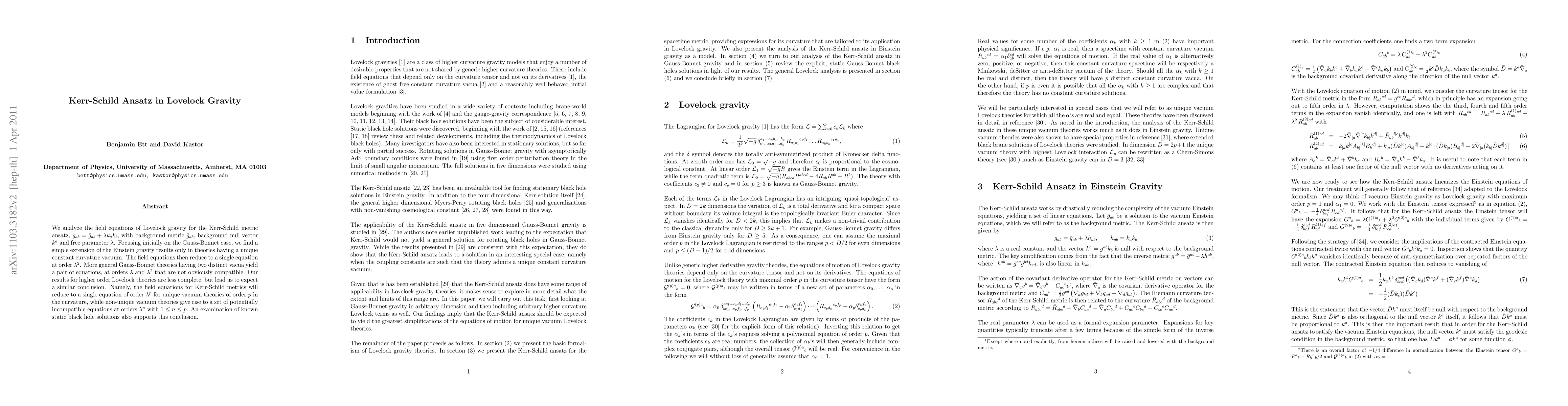 The paper investigates the field equations in Lovelock gravity using the Kerr-Schild metric ansatz, revealing that unique vacuum theories simplify to a single order $\lambda^p$ equation, while non-unique theories produce a set of potentially incompatible equations at orders $\lambda^n$ for $1\le n \le p$. This pattern is supported by known static black hole solutions.