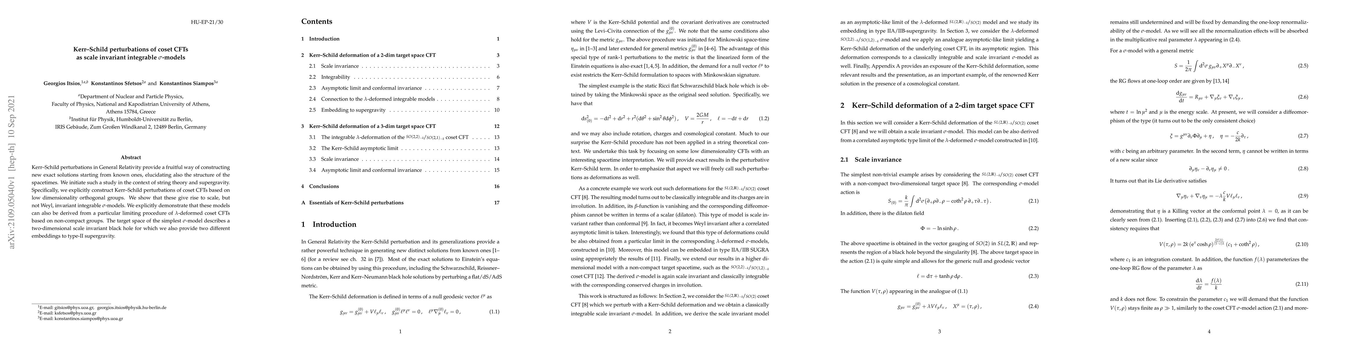 This paper constructs Kerr-Schild perturbations of coset conformal field theories (CFTs) based on low dimensionality orthogonal groups, showing they yield scale invariant integrable σ-models. It also demonstrates these models arise from a limiting procedure of λ-deformed coset CFTs, with a two-dimensional scale invariant black hole described by the simplest σ-model, embedded in type-II supergravity.