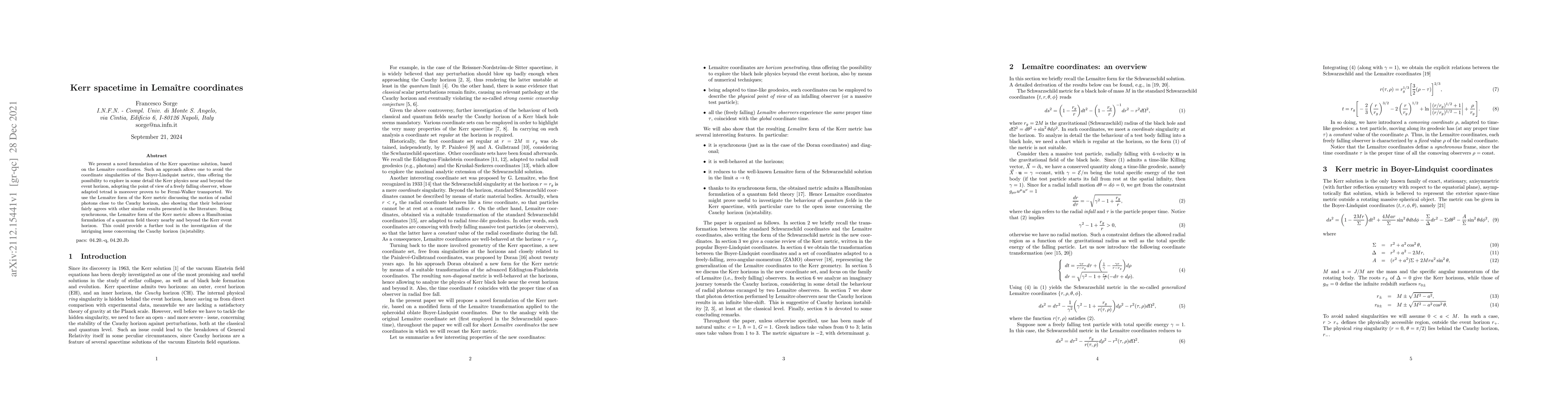 This paper introduces a new Kerr spacetime formulation using Lemaître coordinates to avoid coordinate singularities, enabling detailed exploration of Kerr physics near the event horizon. It discusses the motion of radial photons near the Cauchy horizon and suggests a Hamiltonian formulation for quantum field theory, potentially aiding in the study of Cauchy horizon stability.