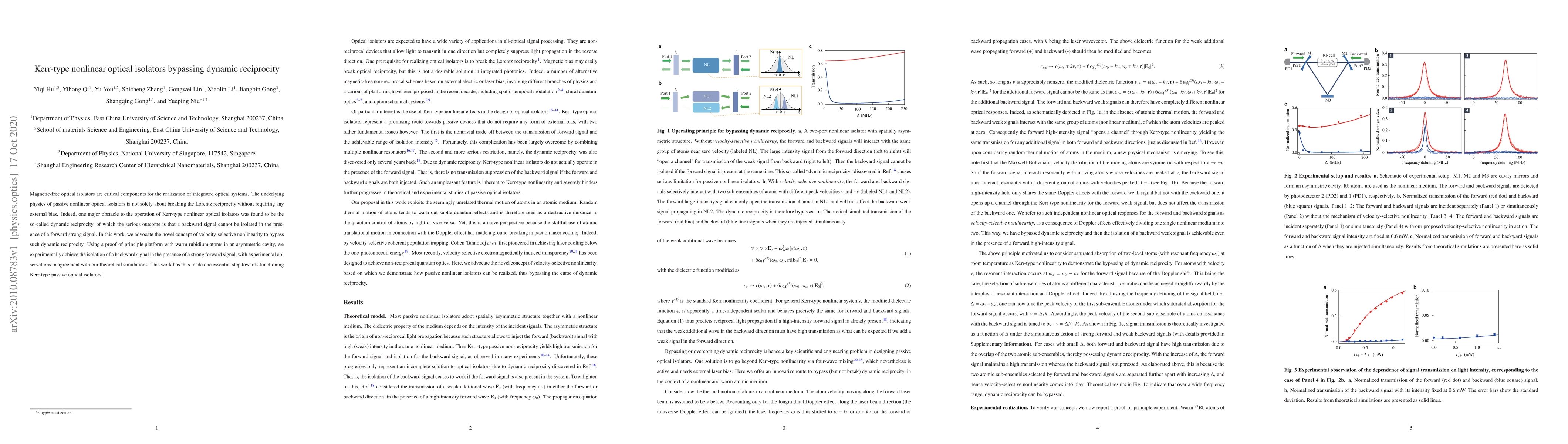 This paper proposes a novel concept of velocity-selective nonlinearity to bypass dynamic reciprocity, enabling the isolation of backward signals in Kerr-type nonlinear optical isolators without external magnetic fields. Experimental results using warm rubidium atoms in an asymmetric cavity demonstrate the successful isolation of a backward signal amidst a strong forward signal, aligning with theoretical simulations.