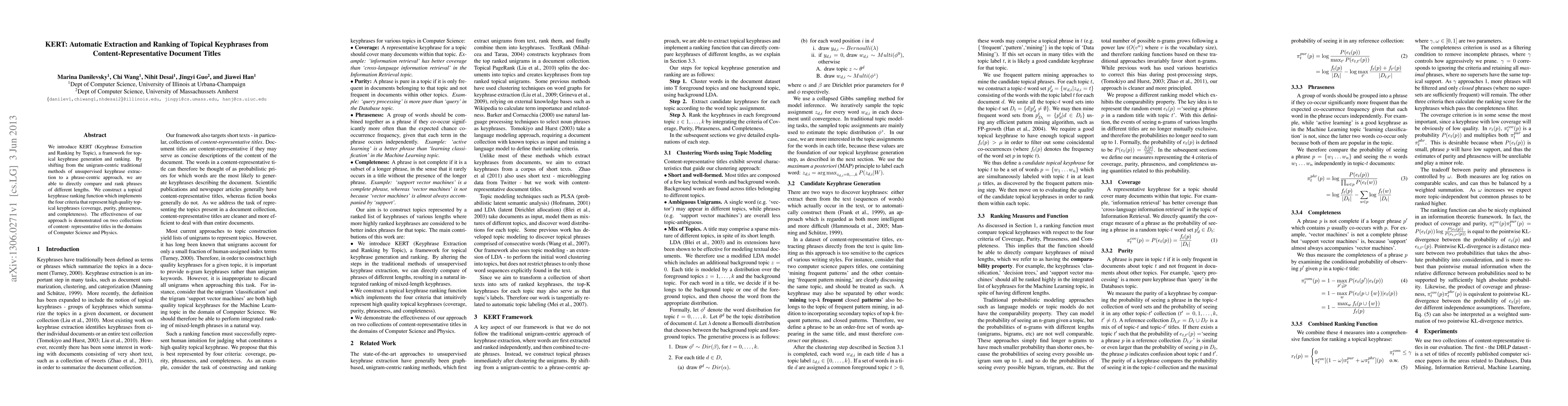 KERT is a framework for generating and ranking topical keyphrases by shifting from unigram-centric methods to a phrase-centric approach, directly comparing and ranking multi-length phrases based on coverage, purity, phraseness, and completeness. Its effectiveness is validated on titles from Computer Science and Physics domains.