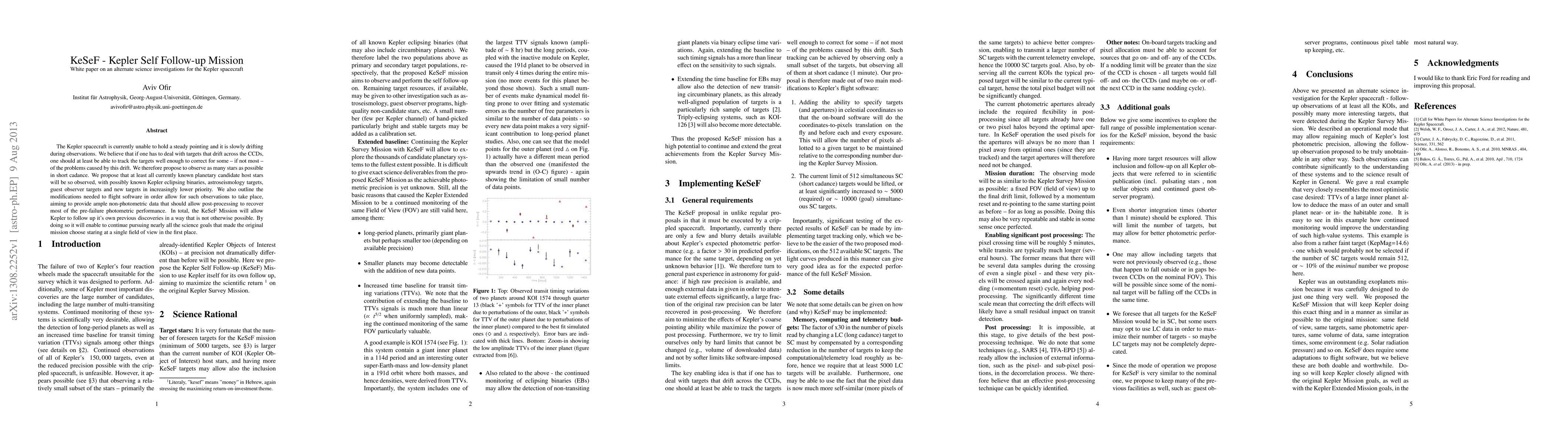 The KeSeF mission aims to address Kepler's inability to maintain steady pointing by observing stars in short cadence, prioritizing planetary candidates and other targets. It proposes software modifications to enable follow-up observations, aiming to recover most of the pre-failure photometric performance and continue the original science goals.