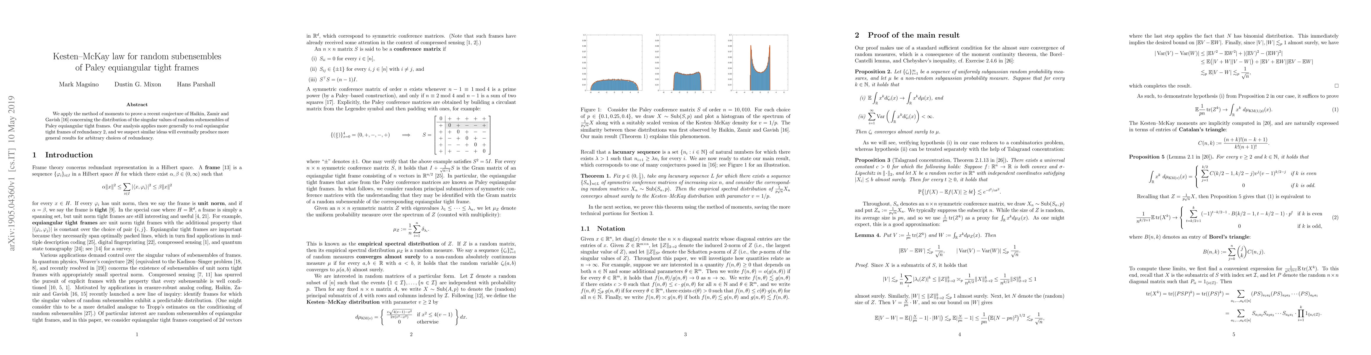 We apply the method of moments to prove a recent conjecture of Haikin, Zamir and Gavish (2017) concerning the distribution of the singular values of random subensembles of Paley equiangular tight frames. Our analysis applies more generally to real equiangular tight frames of redundancy 2, and we suspect similar ideas will eventually produce more general results for arbitrary choices of redundancy.