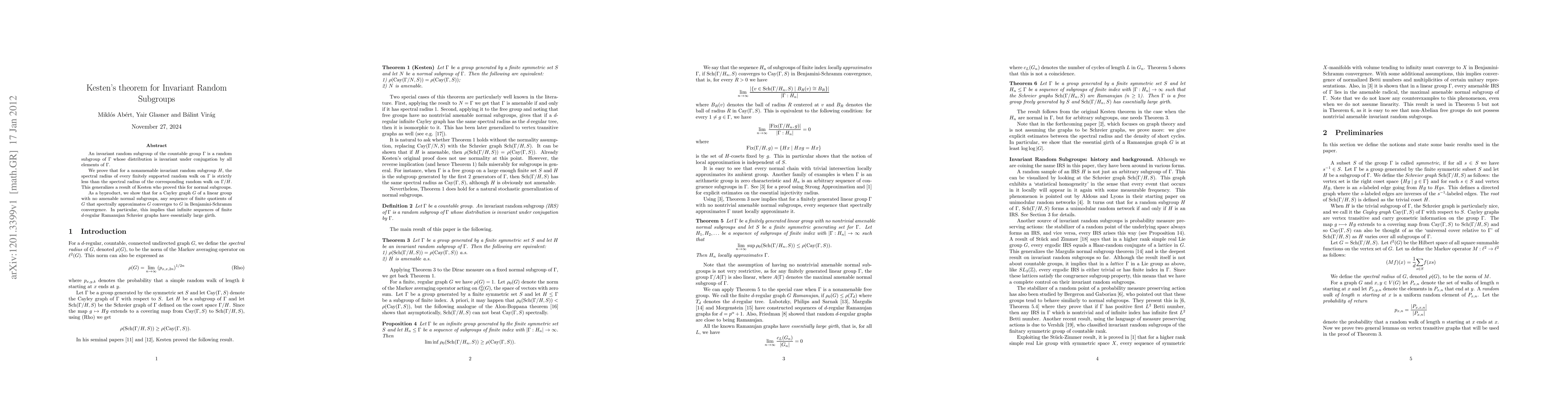 This paper proves that for nonamenable invariant random subgroups of a countable group, the spectral radius of any finitely supported random walk on the group is strictly less than that on the quotient group. This extends Kesten's theorem to non-normal subgroups and implies that infinite sequences of finite d-regular Ramanujan Schreier graphs have large girth.