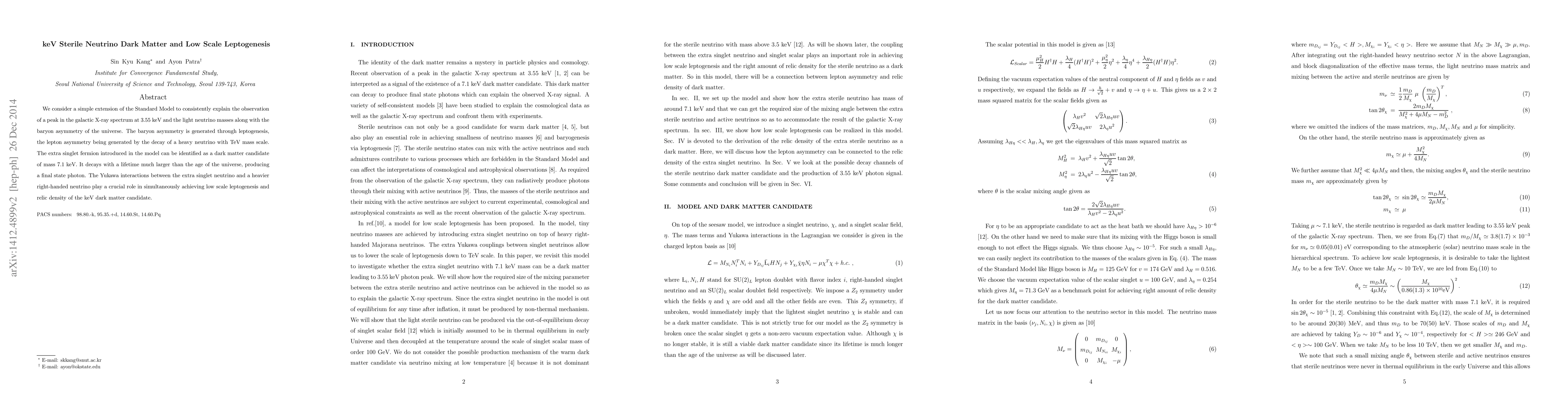 This paper explores an extended Standard Model to explain a 3.55 keV X-ray peak and light neutrino masses, proposing a sterile neutrino as keV dark matter and generating baryon asymmetry via low-scale leptogenesis through the decay of a heavy TeV-scale neutrino. The model's success hinges on Yukawa interactions between the sterile and right-handed neutrinos.