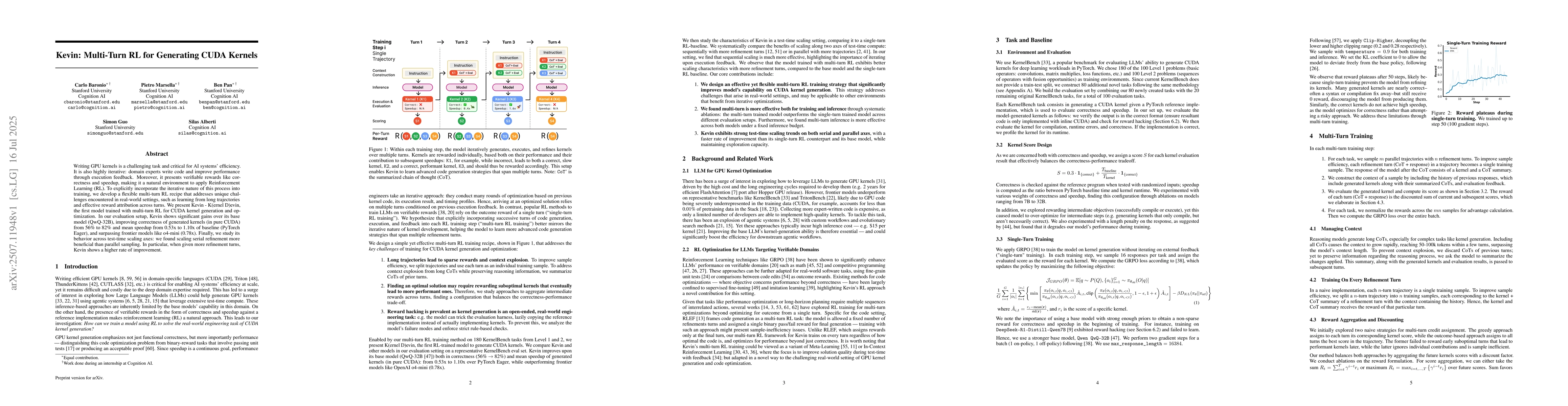Writing GPU kernels is a challenging task and critical for AI systems' efficiency. It is also highly iterative: domain experts write code and improve performance through execution feedback. Moreover, it presents verifiable rewards like correctness and speedup, making it a natural environment to apply Reinforcement Learning (RL). To explicitly incorporate the iterative nature of this process into training, we develop a flexible multi-turn RL recipe that addresses unique challenges encountered in real-world settings, such as learning from long trajectories and effective reward attribution across turns. We present Kevin - K(ernel D)evin, the first model trained with multi-turn RL for CUDA kernel generation and optimization. In our evaluation setup, Kevin shows significant gains over its base model (QwQ-32B), improving correctness of generated kernels (in pure CUDA) from 56% to 82% and mean speedup from 0.53x to 1.10x of baseline (PyTorch Eager), and surpassing frontier models like o4-mini (0.78x). Finally, we study its behavior across test-time scaling axes: we found scaling serial refinement more beneficial than parallel sampling. In particular, when given more refinement turns, Kevin shows a higher rate of improvement.