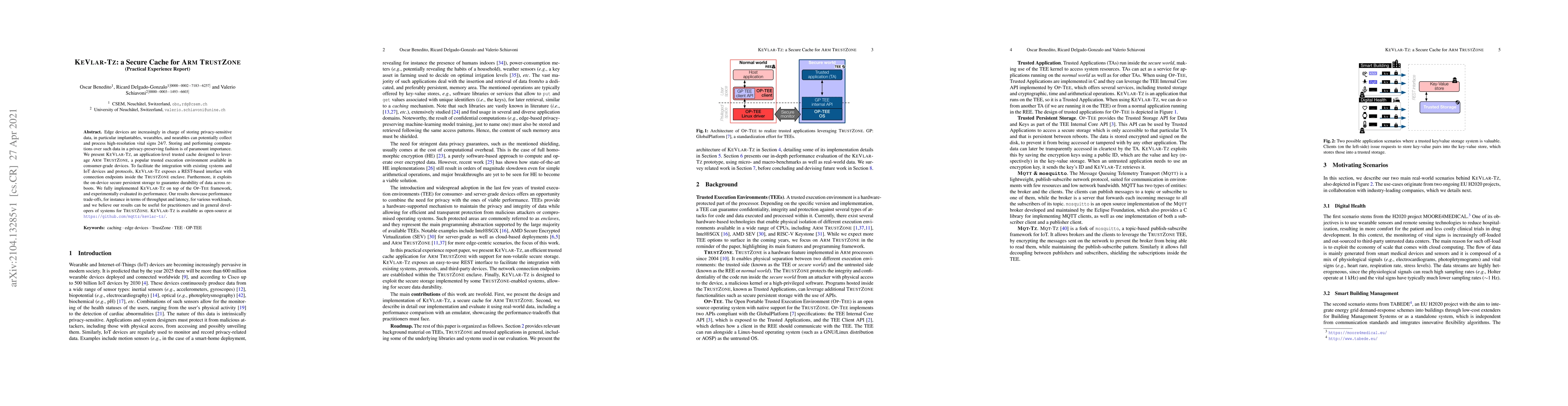KEVLAR-TZ is an application-level trusted cache leveraging ARM TrustZone to secure the storage and processing of privacy-sensitive data on edge devices. It provides a REST-based interface and utilizes secure persistent storage for data durability, and has been implemented on OP-TEE with performance evaluations available.
