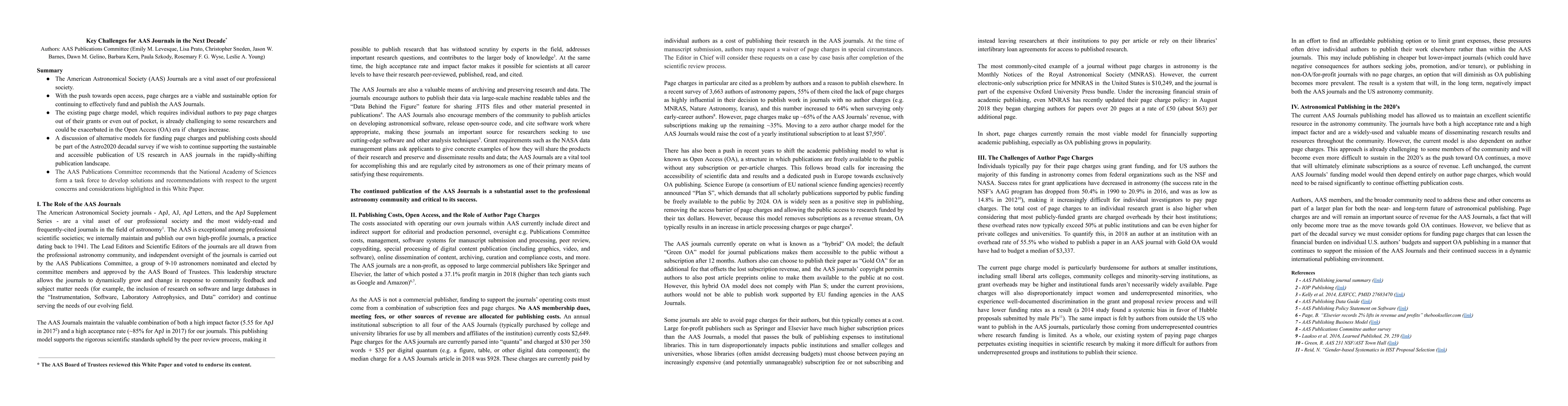 The American Astronomical Society (AAS) Journals are a vital asset of our professional society. With the push towards open access, page charges are a viable and sustainable option for continuing to effectively fund and publish the AAS Journals. However, the existing page charge model, which requires individual authors to pay page charges out of their grants or even out of pocket, is already challenging to some researchers and could be exacerbated in the Open Access (OA) era if charges increase. A discussion of alternative models for funding page charges and publishing costs should be part of the Astro2020 decadal survey if we wish to continue supporting the sustainable and accessible publication of US research in AAS journals in the rapidly-shifting publication landscape. The AAS Publications Committee recommends that the National Academy of Sciences form a task force to develop solutions and recommendations with respect to the urgent concerns and considerations highlighted in this White Paper.