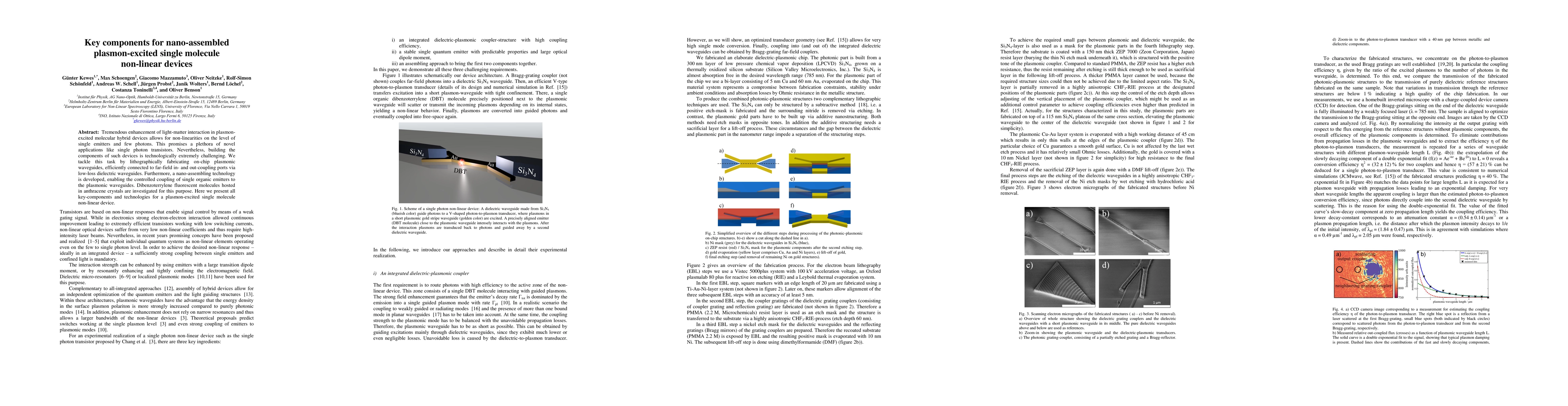 This paper details the fabrication of key components for plasmon-excited single molecule non-linear devices, including on-chip plasmonic waveguides and low-loss dielectric waveguides, alongside a nano-assembling technology for coupling single organic emitters, demonstrating potential for novel applications like single photon transistors.