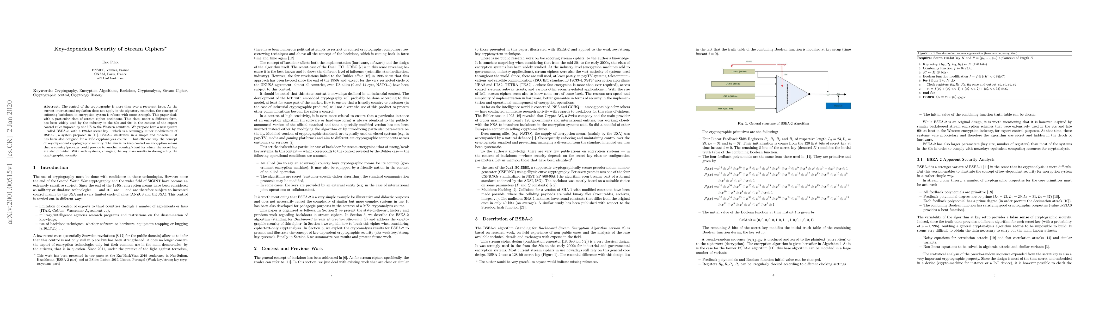 The control of the cryptography is more than ever a recurrent issue. As the current international regulation does not apply in the signatory countries, the concept of enforcing backdoors in encryption system is reborn with more strength. This paper deals with a particular class of stream cipher backdoors. This class, under a different form, has been widely used by the industry in the 80s and 90s in the context of the export control rules imposed by the US to the Western countries. We propose here a new system -- called BSEA-2, with a 128-bit secret key -- which is a seemingly minor modification of BSEA-1, a system proposed in \cite{filiol_bsea1}. BSEA-2 illustrates, in a simple and didactic~\textemdash~it has been also designed for a MSc cryptanalysis course~\textemdash~but efficient way the concept of key-dependent cryptographic security. The aim is to keep control on encryption means that a country/provider could provide to another country/client for which the secret key are also provided. With such systems, changing the key class results in downgrading the cryptographic security.
