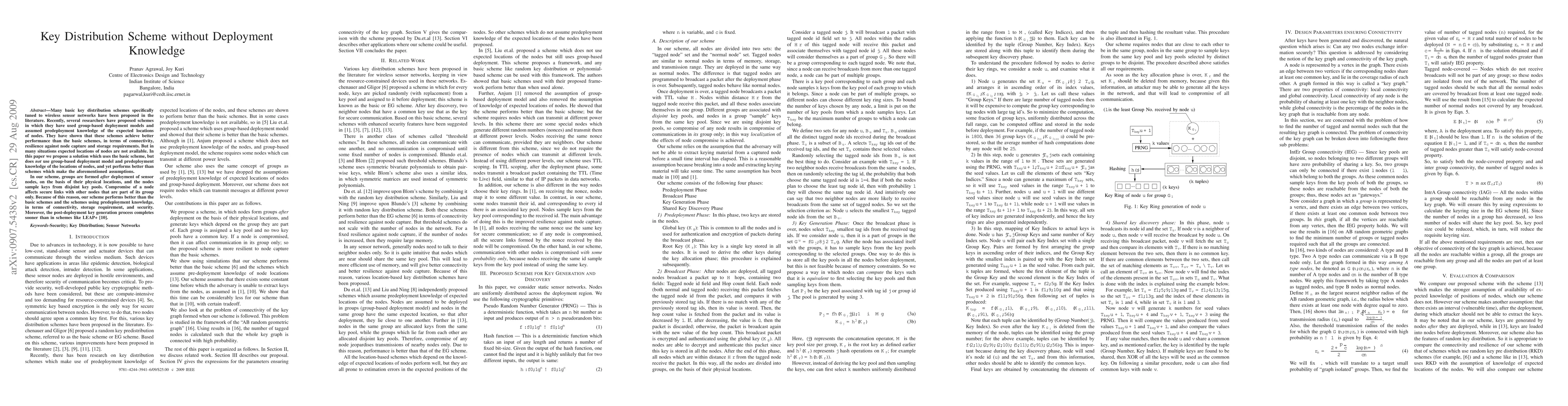 This paper proposes a key distribution scheme for wireless sensor networks that does not rely on predeployment knowledge of node locations. It forms groups post-deployment based on physical locations and uses disjoint key pools, achieving better connectivity, storage efficiency, and security compared to schemes that assume predeployment knowledge.
