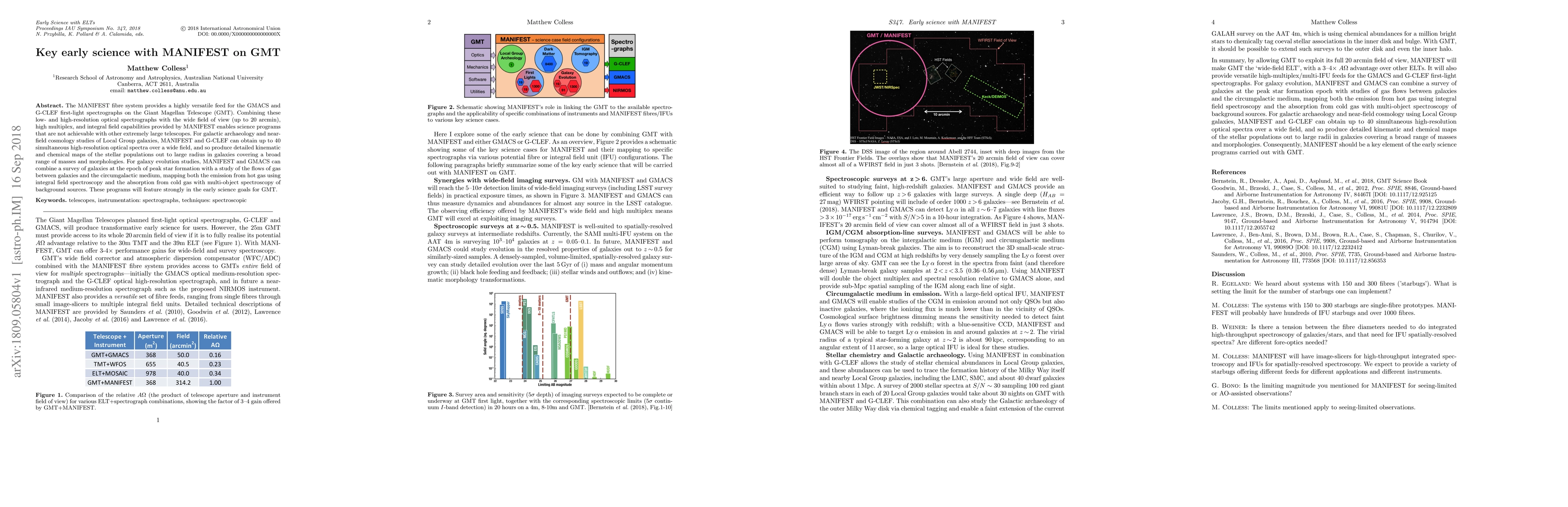 The MANIFEST fibre system provides a highly versatile feed for the GMACS and G-CLEF first-light spectrographs on the Giant Magellan Telescope (GMT). Combining these low- and high-resolution optical spectrographs with the wide field of view (up to 20 arcmin), high multiplex, and integral field capabilities provided by MANIFEST enables science programs that are not achievable with other extremely large telescopes. For galactic archaeology and near-field cosmology studies of Local Group galaxies, MANIFEST and G-CLEF can obtain up to 40 simultaneous high-resolution optical spectra over a wide field, and so produce detailed kinematic and chemical maps of the stellar populations out to large radius in galaxies covering a broad range of masses and morphologies. For galaxy evolution studies, MANIFEST and GMACS can combine a survey of galaxies at the epoch of peak star formation with a study of the flows of gas between galaxies and the circumgalactic medium, mapping both the emission from hot gas using integral field spectroscopy and the absorption from cold gas with multi-object spectroscopy of background sources. These programs will feature strongly in the early science goals for GMT.