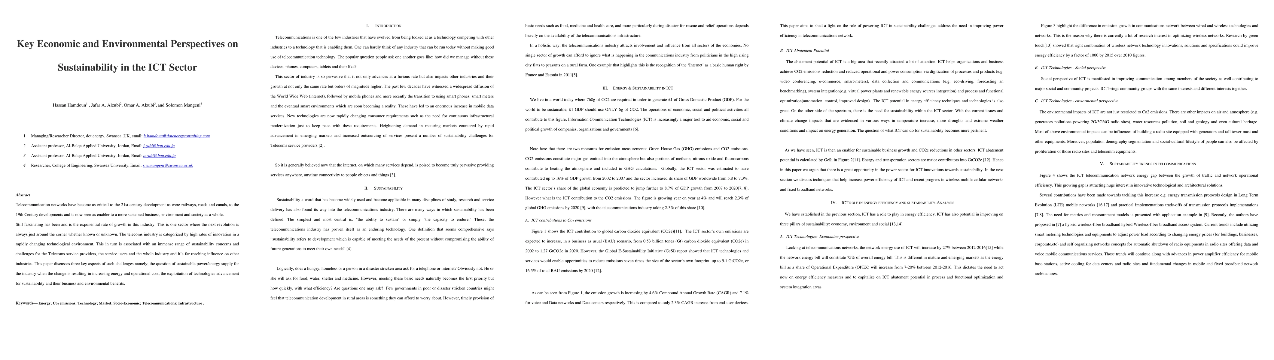 The research paper discusses three key aspects of sustainability challenges in the ICT sector: sustainable power/energy supply, exploitation of technologies advancement for sustainability and business and environmental benefits.