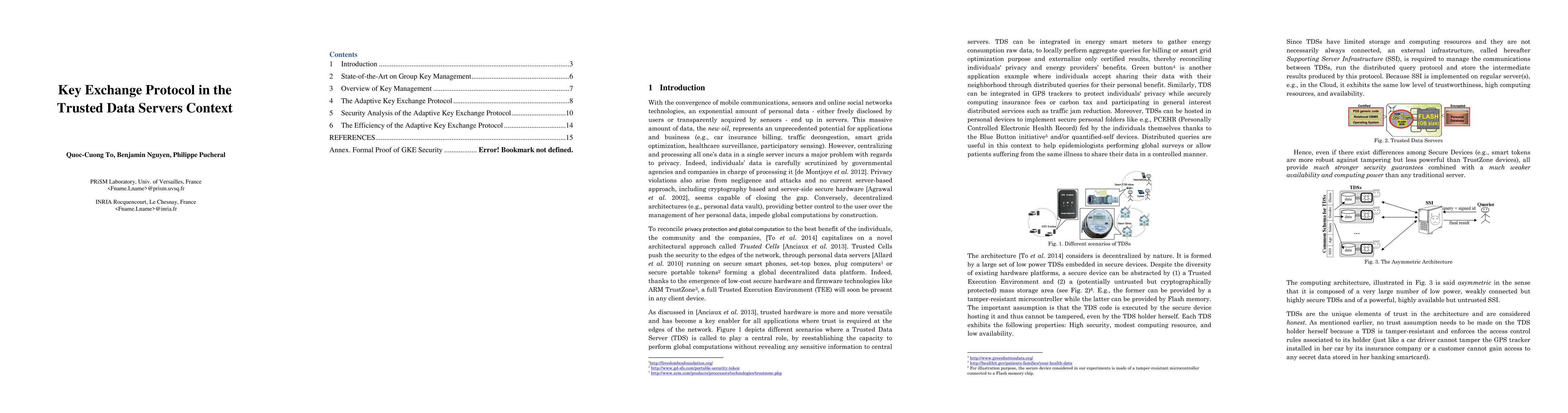 The aim of this technical report is to complement the work in [To et al. 2014] by proposing a Group Key Exchange protocol so that the Querier and TDSs (and TDSs themselves) can securely create and exchange the shared key. Then, the security of this protocol is formally proved using the game-based model. Finally, we perform the comparison between this protocol and other related works.