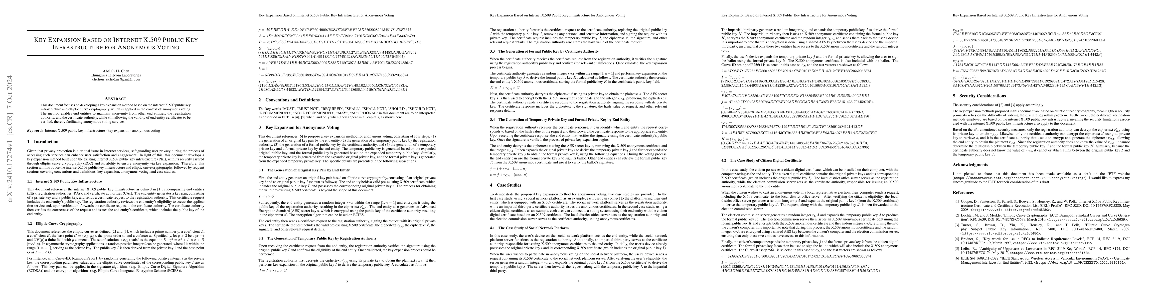 This document focuses on developing a key expansion method based on the internet X.509 public key infrastructure and elliptic curve cryptography, which is applied in the context of anonymous voting. The method enables end entities to maintain anonymity from other end entities, the registration authority, and the certificate authority, while still allowing the validity of end entity certificates to be verified, thereby facilitating anonymous voting services.