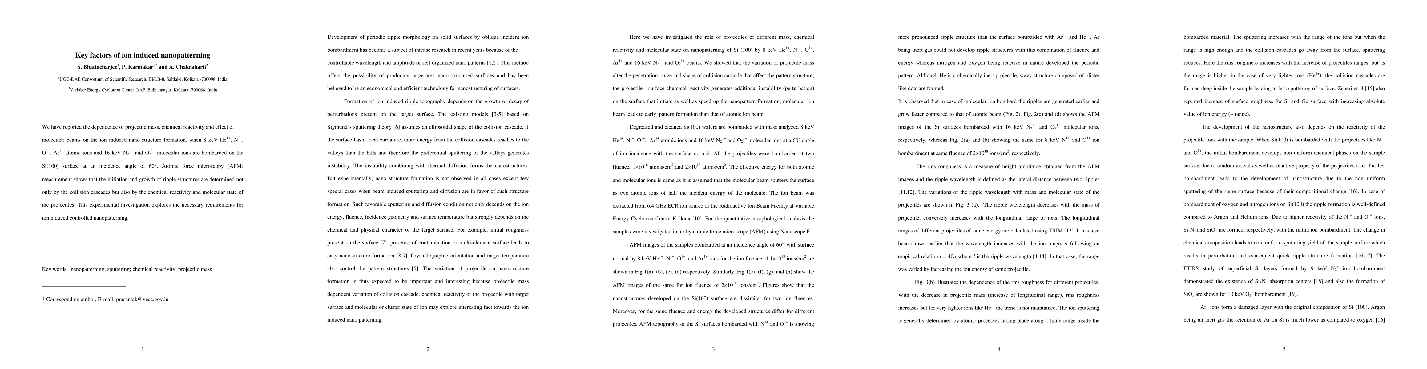 We have reported the dependence of projectile mass, chemical reactivity and effect of molecular beams on the ion induced nano structure formation, when 8 keV He1+, N1+, O1+, Ar1+ atomic ions and 16 keV N21+ and O21+ molecular ions are bombarded on the Si(100) surface at an incidence angle of 60^{\circ}. Atomic force microscopy (AFM) measurement shows that the initiation and growth of ripple structures are determined not only by the collision cascades but also by the chemical reactivity and molecular state of the projectiles. This experimental investigation explores the necessary requirements for ion induced controlled nanopatterning.