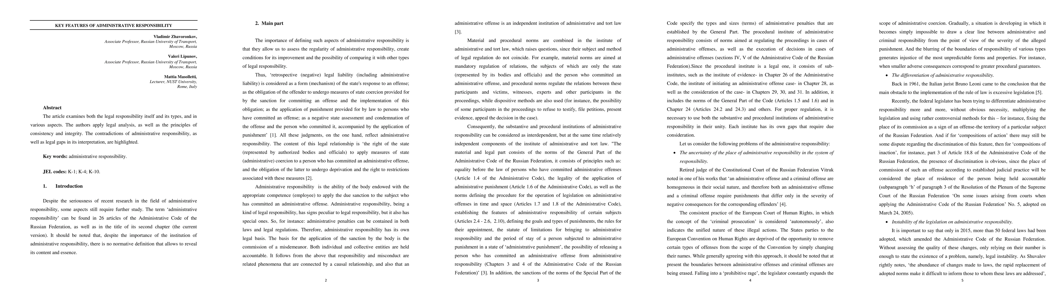 The article examines both the legal responsibility itself and its types, and in various aspects. The authors apply legal analysis, as well as the principles of consistency and integrity. The contradictions of administrative responsibility, as well as legal gaps in its interpretation, are highlighted.