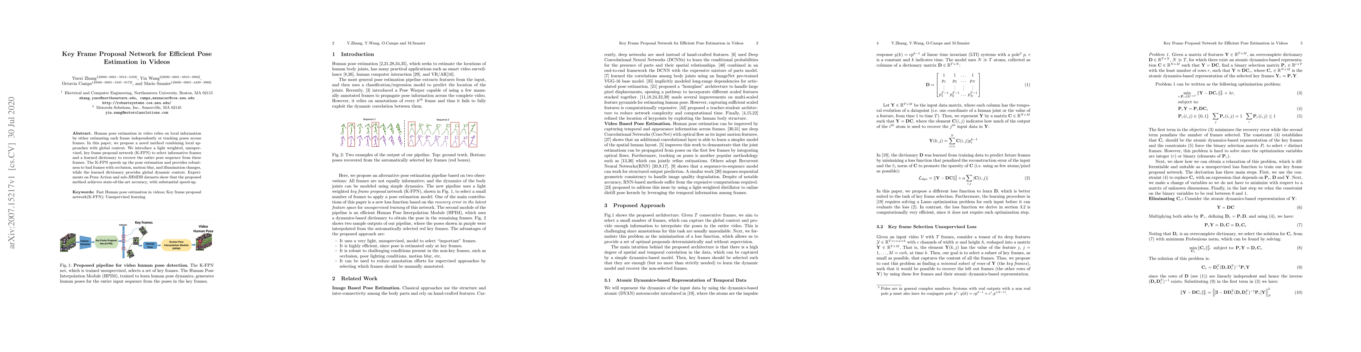 Human pose estimation in video relies on local information by either estimating each frame independently or tracking poses across frames. In this paper, we propose a novel method combining local approaches with global context. We introduce a light weighted, unsupervised, key frame proposal network (K-FPN) to select informative frames and a learned dictionary to recover the entire pose sequence from these frames. The K-FPN speeds up the pose estimation and provides robustness to bad frames with occlusion, motion blur, and illumination changes, while the learned dictionary provides global dynamic context. Experiments on Penn Action and sub-JHMDB datasets show that the proposed method achieves state-of-the-art accuracy, with substantial speed-up.