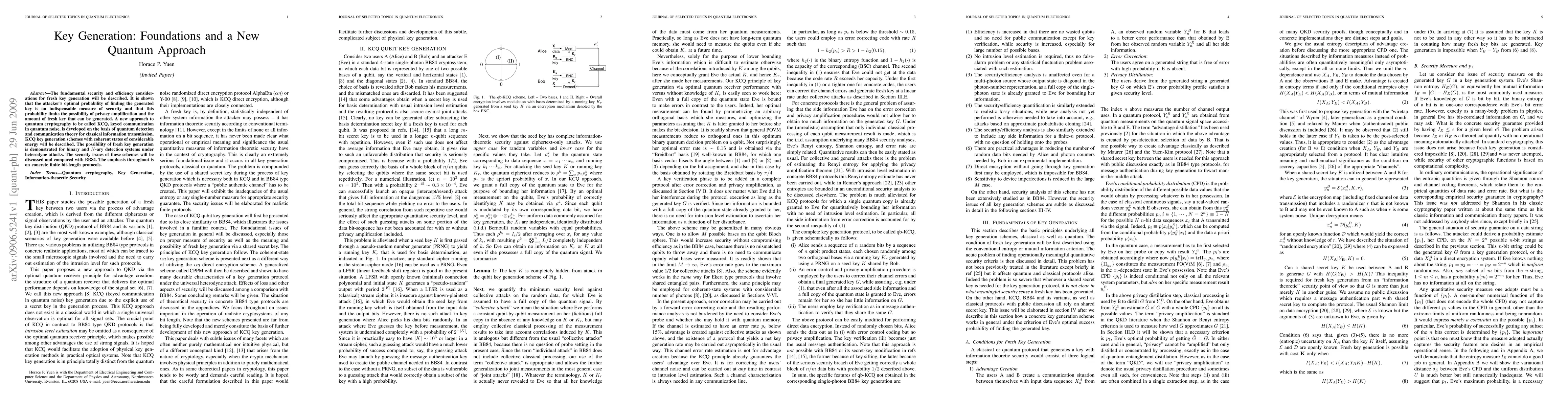 This paper explores the security and efficiency of key generation, emphasizing the attacker's optimal probability as a security measure. It introduces a new quantum cryptography approach, KCQ, for generating fresh keys using quantum detection and communication theory, and compares its security with the BB84 protocol.