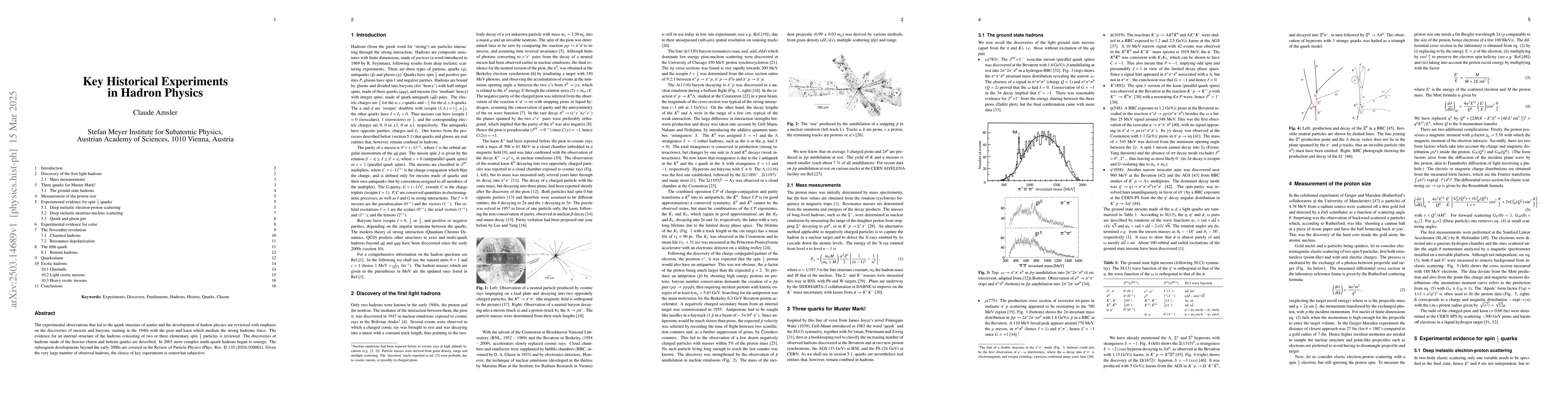 The paper reviews key historical experiments in hadron physics, focusing on the discoveries of mesons and baryons, the evidence for an internal structure of hadrons, and the discoveries of hadrons containing heavier charm and bottom quarks.