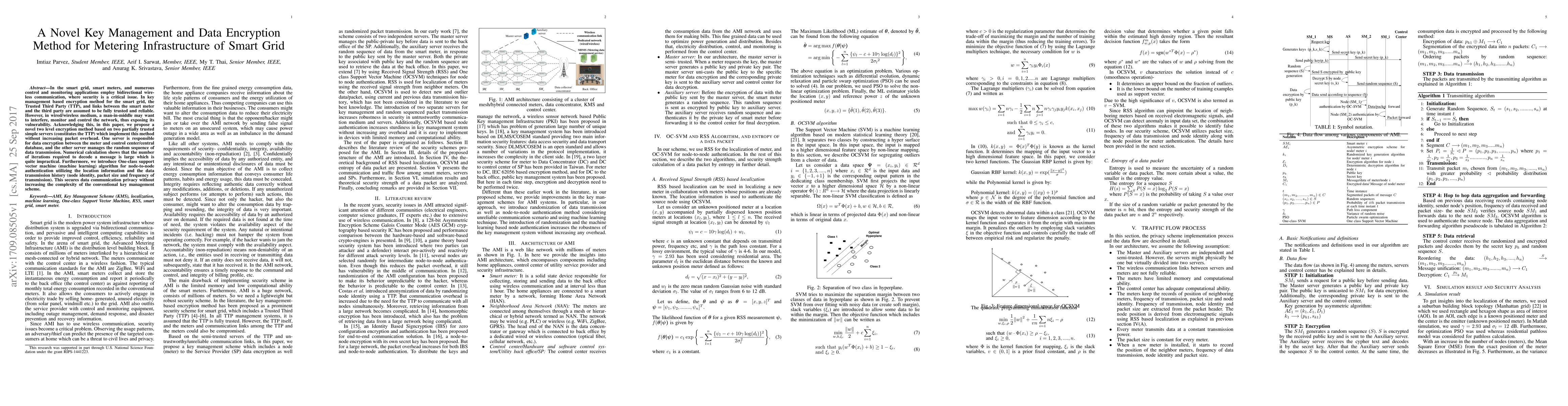 In the smart grid, smart meters, and numerous control and monitoring applications employ bidirectional wireless communication, where security is a critical issue. In key management based encryption method for the smart grid, the Trusted Third Party (TTP), and links between the smart meter and the third party are assumed to be fully trusted and reliable. However, in wired/wireless medium, a man-in-middle may want to interfere, monitor and control the network, thus exposing its vulnerability. Acknowledging this, in this paper, we propose a novel two level encryption method based on two partially trusted simple servers (constitutes the TTP) which implement this method without increasing packet overhead. One server is responsible for data encryption between the meter and control center/central database, and the other server manages the random sequence of data transmission. Numerical calculation shows that the number of iterations required to decode a message is large which is quite impractical. Furthermore, we introduce One-class support vector machine (machine learning) algorithm for node-to-node authentication utilizing the location information and the data transmission history (node identity, packet size and frequency of transmission). This secures data communication privacy without increasing the complexity of the conventional key management scheme.