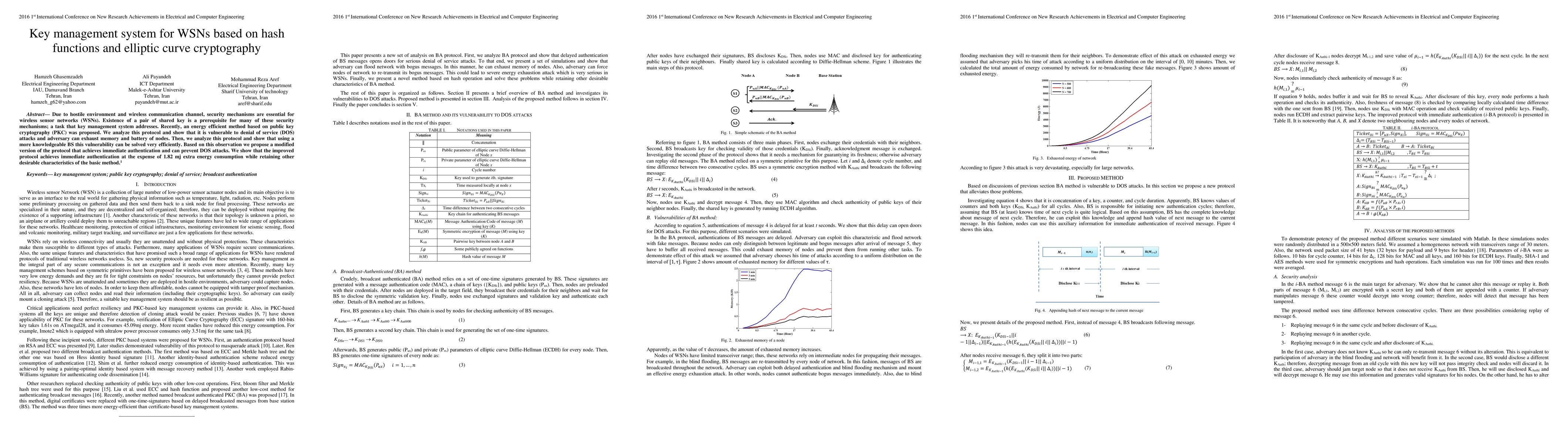 This paper proposes a key management system for wireless sensor networks that uses hash functions and elliptic curve cryptography to improve security. It identifies vulnerabilities in existing public key cryptography protocols, particularly susceptibility to denial of service attacks, and suggests a modified protocol that enhances immediate authentication while incurring a small increase in energy consumption.