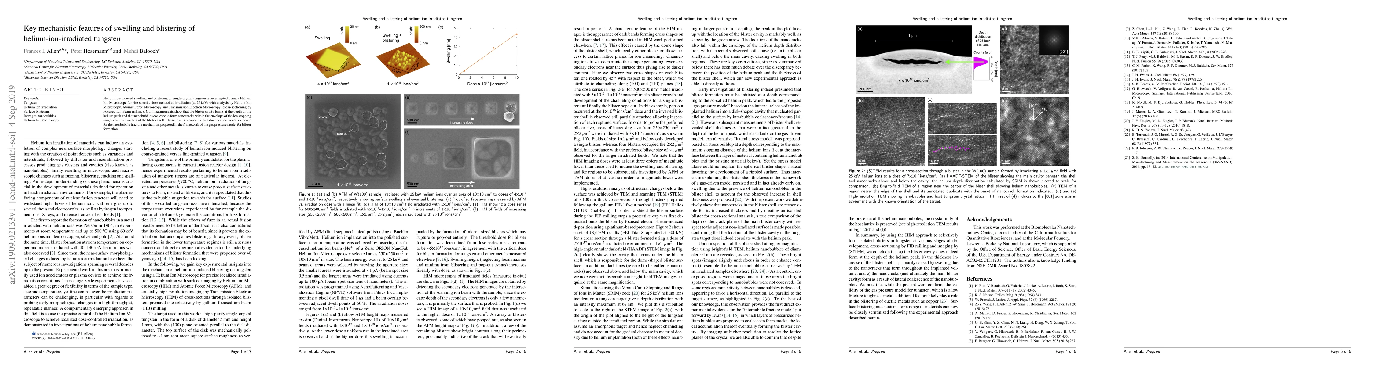 This study investigates helium-ion-induced swelling and blistering in tungsten using advanced microscopy techniques. The research reveals that blister cavities form at the helium peak depth, with nanobubbles coalescing to create nanocracks within the ion stopping range, supporting the interbubble fracture mechanism for blister formation.