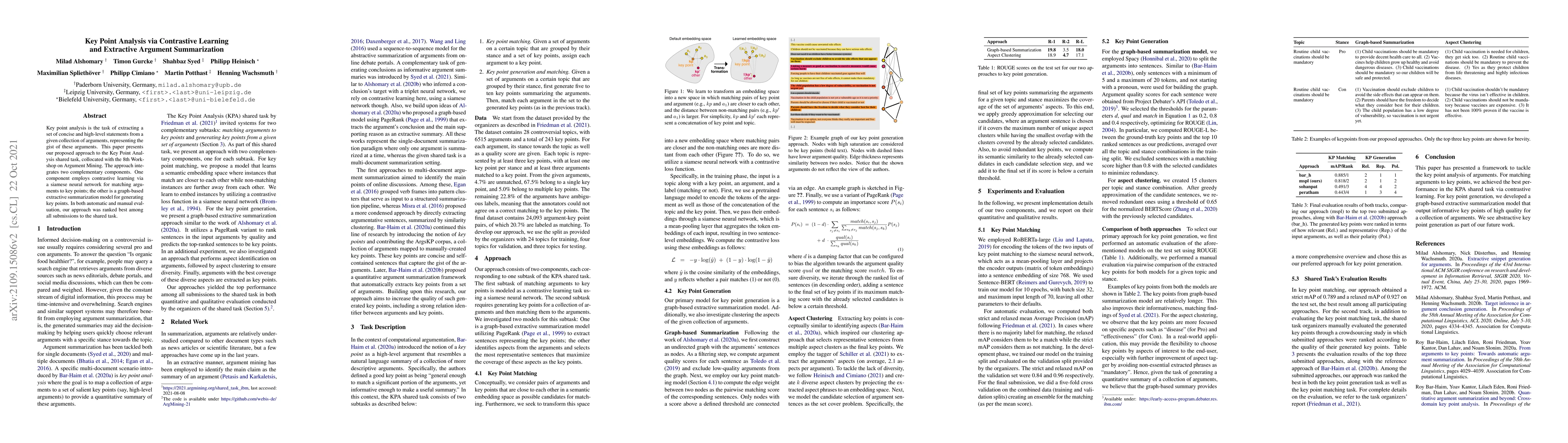 Key point analysis is the task of extracting a set of concise and high-level statements from a given collection of arguments, representing the gist of these arguments. This paper presents our proposed approach to the Key Point Analysis shared task, collocated with the 8th Workshop on Argument Mining. The approach integrates two complementary components. One component employs contrastive learning via a siamese neural network for matching arguments to key points; the other is a graph-based extractive summarization model for generating key points. In both automatic and manual evaluation, our approach was ranked best among all submissions to the shared task.