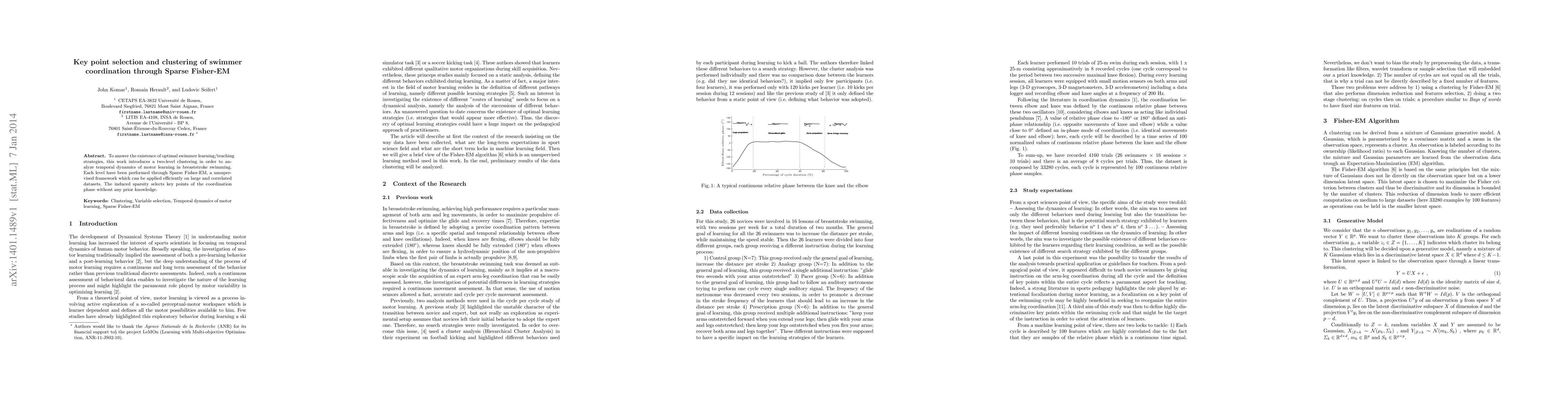 This paper employs Sparse Fisher-EM for a two-level clustering analysis to explore optimal learning strategies in breaststroke swimming, identifying key coordination points through induced sparsity without prior knowledge. The method efficiently handles large, correlated datasets to study temporal dynamics in motor learning.