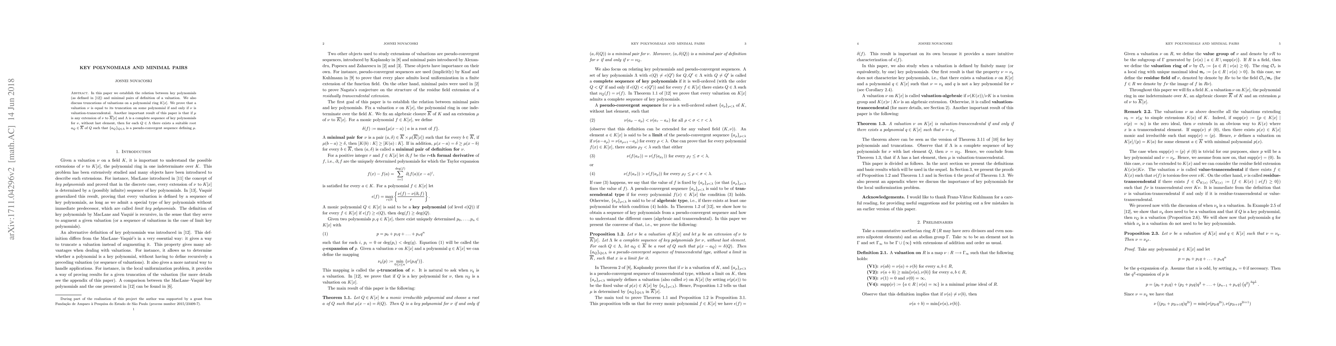 This paper establishes a connection between key polynomials and minimal pairs in the context of valuation theory, proving that a valuation equals its truncation on a polynomial if it is valuation-transcendental. It also shows that a complete sequence of key polynomials can define an extension of the valuation through pseudo-convergent roots.