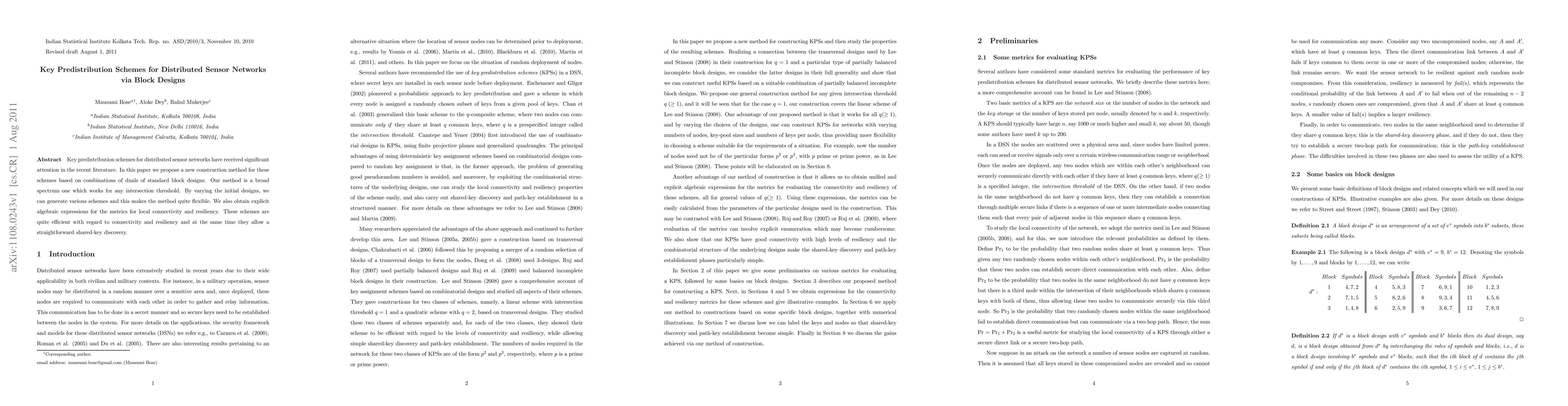 This paper introduces a new key predistribution method for distributed sensor networks using combinations of duals of standard block designs, which offers flexibility across various intersection thresholds and provides explicit algebraic metrics for local connectivity and resiliency. The proposed schemes are efficient and facilitate straightforward shared-key discovery.
