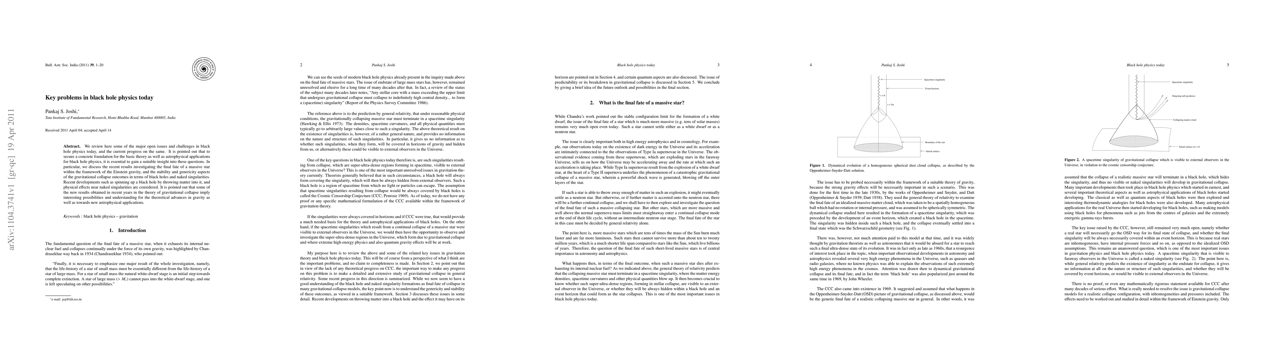 We review here some of the major open issues and challenges in black hole physics today, and the current progress on the same. It is pointed out that to secure a concrete foundation for the basic theory as well as astrophysical applications for black hole physics, it is essential to gain a suitable insight into these questions. In particular, we discuss the recent results investigating the final fate of a massive star within the framework of the Einstein gravity, and the stability and genericity aspects of the gravitational collapse outcomes in terms of black holes and naked singularities. Recent developments such as spinning up a black hole by throwing matter into it, and physical effects near naked singularities are considered. It is pointed out that some of the new results obtained in recent years in the theory of gravitational collapse imply interesting possibilities and understanding for the theoretical advances in gravity as well as towards new astrophysical applications.