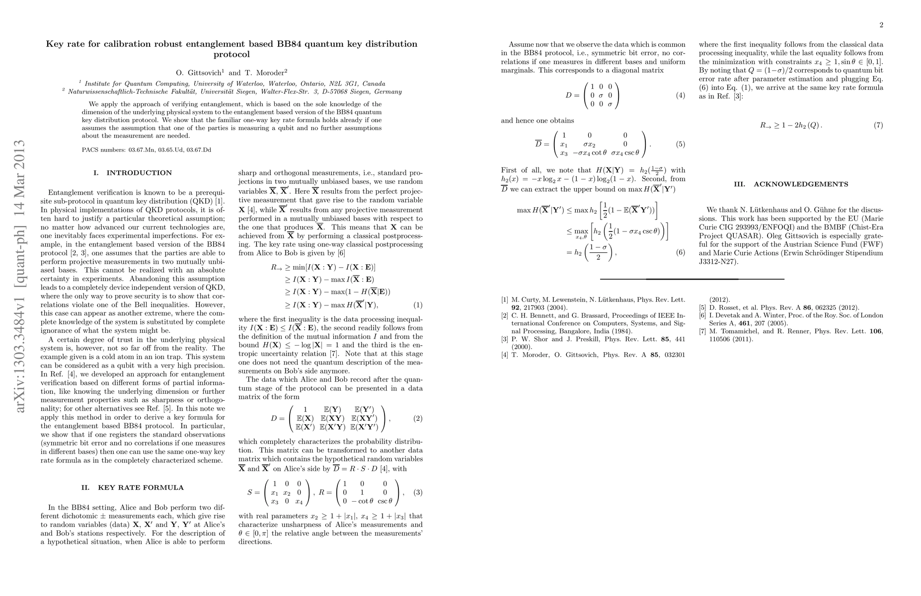 We apply the approach of verifying entanglement, which is based on the sole knowledge of the dimension of the underlying physical system to the entanglement based version of the BB84 quantum key distribution protocol. We show that the familiar one-way key rate formula holds already if one assumes the assumption that one of the parties is measuring a qubit and no further assumptions about the measurement are needed.