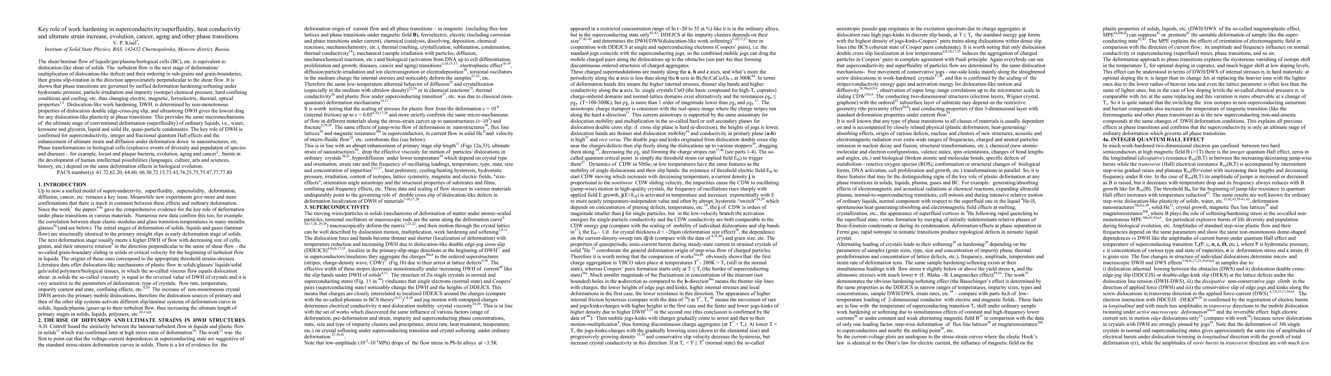 The shear/laminar flow of liquids/gas/plasma/biological cells (BC), etc. is equivalent to dislocation-like shear of solids. The turbulent flow is the next stage of deformation/ multiplication of dislocation-like defects and their ordering in sub-grains and grain-boundaries, then grains slip-rotation in the direction approximately perpendicular to the shear flow. It is shown that phase transitions are governed by unified deformation hardening/softening under hydrostatic pressure, particle irradiation and impurity (isotope) chemical pressure, hard confining conditions and cooling, etc. thus changing electric, magnetic, ferroelectric, thermal, optical properties.1-2 Dislocation-like work hardening, DWH, is determined by non-monotonous properties of dislocation double edge-cross-jog slip, and ultrastrong DWH gives the lowest drag for any dislocation-like plasticity at phase transitions. This provides the same micromechanisms of the ultimate stage of conventional deformation (superfluidity) of ordinary liquids, i.e., water, kerosene and glycerin, liquid and solid He, quasi-particle condensates. The key role of DWH is confirmed for superconductivity, integer and fractional quantum Hall effects and the enhancement of ultimate strain and diffusion under deformation down to nanostructures, etc. Phase transformations in biological cells (explosive events of diversity and population of species and diseases - for example, locust and plaque bacteria, evolution, aging and cancer,2 bursts in the development of human intellectual possibilities (languages, culture, arts and sciences, history, etc.) depend on the same deformation effects in biological evolution.