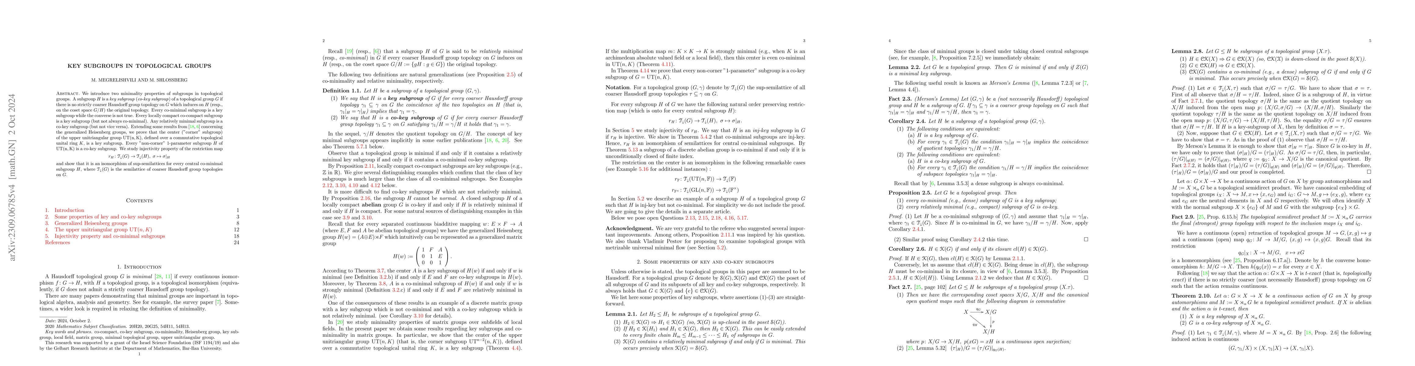 This paper introduces the concept of key subgroups in topological groups, showing that every co-minimal subgroup is a key subgroup but not vice versa. It proves that the center of the upper unitriangular group $\operatorname{UT}(n,K)$ is a key subgroup, and is co-minimal if the multiplication map in $K$ is strongly minimal, exemplified by archimedean absolute valued fields or local fields.