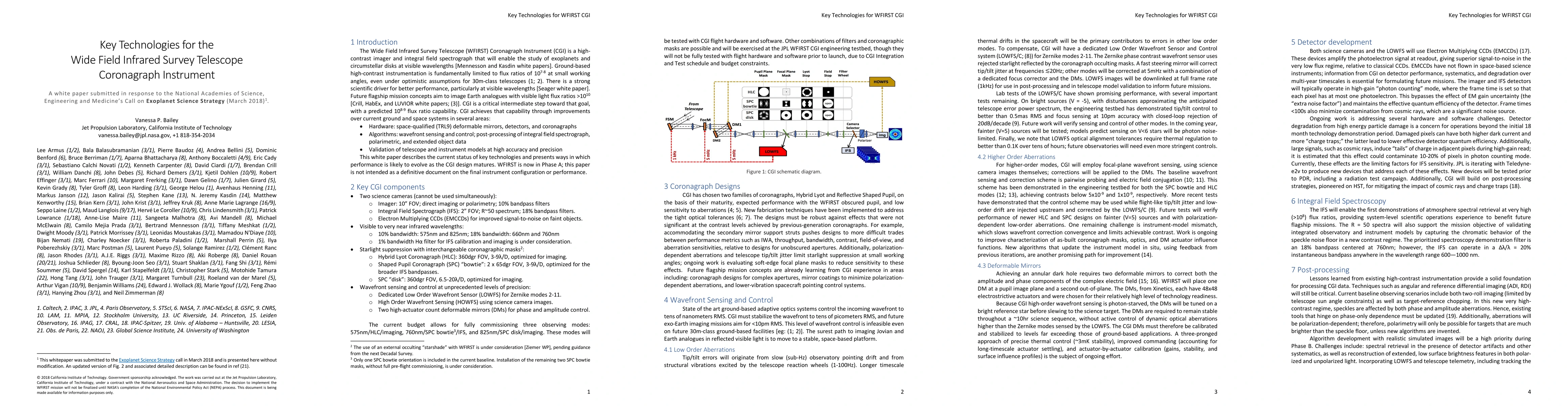 The Wide Field Infrared Survey Telescope (WFIRST) Coronagraph Instrument (CGI) is a high-contrast imager and integral field spectrograph that will enable the study of exoplanets and circumstellar disks at visible wavelengths. Ground-based high-contrast instrumentation has fundamentally limited performance at small working angles, even under optimistic assumptions for 30m-class telescopes. There is a strong scientific driver for better performance, particularly at visible wavelengths. Future flagship mission concepts aim to image Earth analogues with visible light flux ratios of more than 10^10. CGI is a critical intermediate step toward that goal, with a predicted 10^8-9 flux ratio capability in the visible. CGI achieves this through improvements over current ground and space systems in several areas: (i) Hardware: space-qualified (TRL9) deformable mirrors, detectors, and coronagraphs, (ii) Algorithms: wavefront sensing and control; post-processing of integral field spectrograph, polarimetric, and extended object data, and (iii) Validation of telescope and instrument models at high accuracy and precision. This white paper, submitted to the 2018 NAS Exoplanet Science Strategy call, describes the status of key CGI technologies and presents ways in which performance is likely to evolve as the CGI design matures.