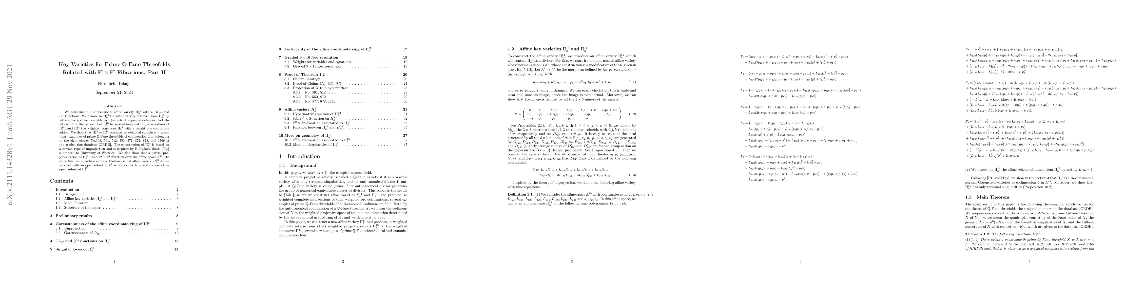 This paper constructs a $15$-dimensional affine variety $\Pi_{\mathbb{A}}^{15}$ with specific actions, and shows that its weighted projectivizations yield prime $\mathbb{Q}$-Fano threefolds of codimension four. It also demonstrates a $\mathbb{P}^{2}\times\mathbb{P}^{2}$-fibration over $\mathbb{A}^{10}$ from a partial projectivization of $\Pi_{\mathbb{A}}^{15}$.