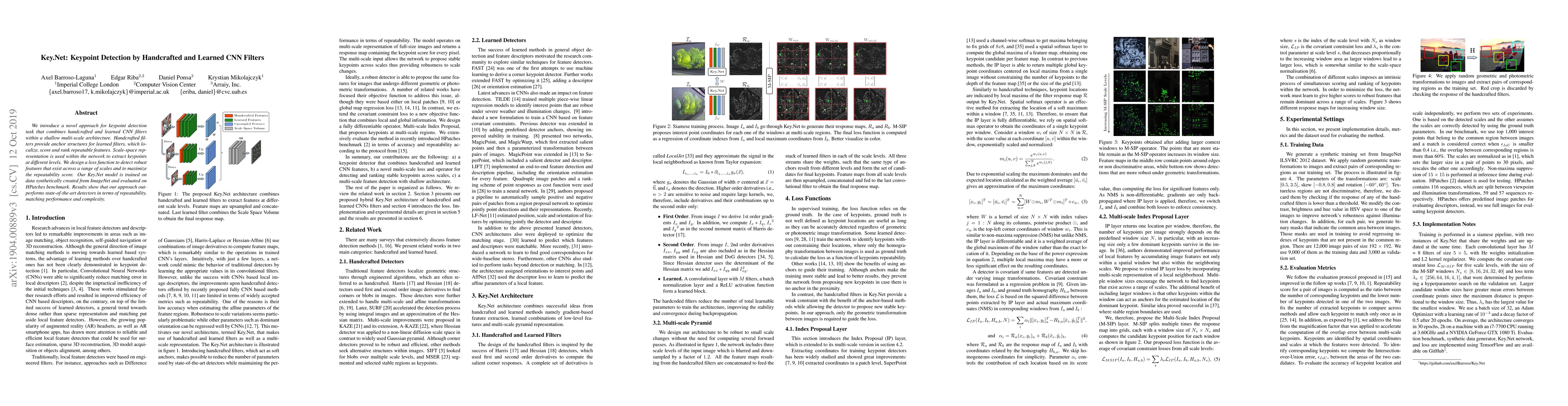 Key.Net combines handcrafted and learned CNN filters in a shallow multi-scale architecture to detect keypoints, achieving superior repeatability and matching performance compared to state-of-the-art methods. The model is trained on synthetic ImageNet data and evaluated on HPatches, demonstrating its effectiveness.