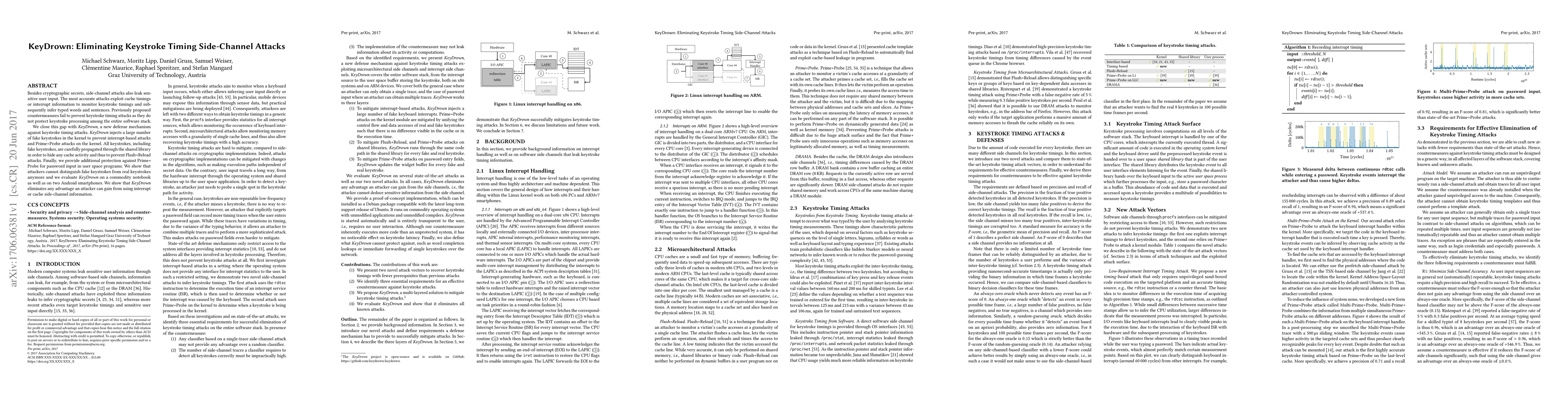 KeyDrown defends against keystroke timing side-channel attacks by injecting fake keystrokes in the kernel and propagating them through the software stack to obscure cache activity. Evaluations on various devices show it effectively neutralizes interrupt and cache-based attacks.
