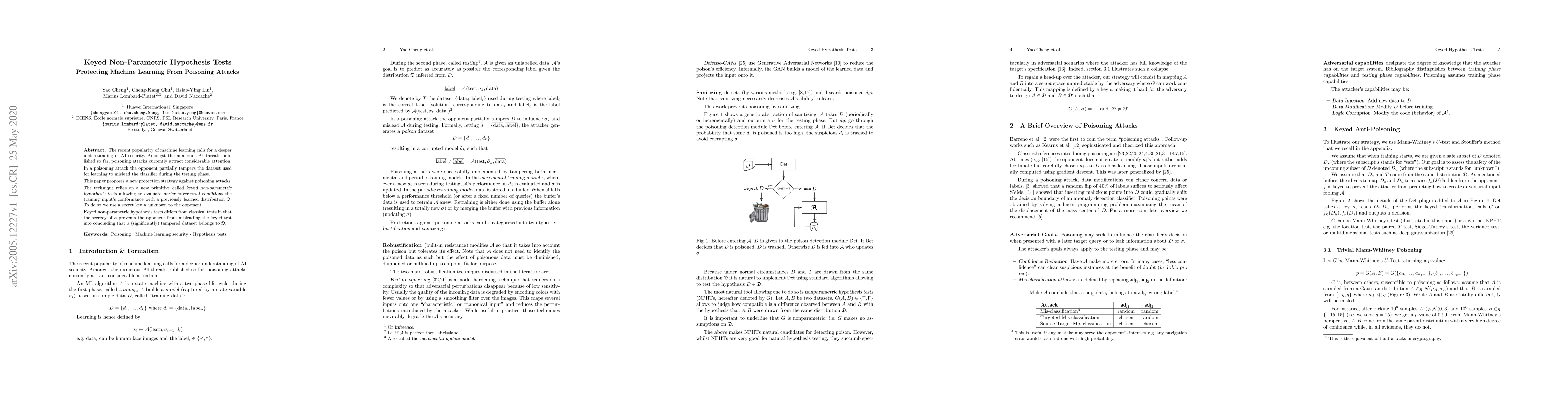 The recent popularity of machine learning calls for a deeper understanding of AI security. Amongst the numerous AI threats published so far, poisoning attacks currently attract considerable attention. In a poisoning attack the opponent partially tampers the dataset used for learning to mislead the classifier during the testing phase. This paper proposes a new protection strategy against poisoning attacks. The technique relies on a new primitive called keyed non-parametric hypothesis tests allowing to evaluate under adversarial conditions the training input's conformance with a previously learned distribution $\mathfrak{D}$. To do so we use a secret key $\kappa$ unknown to the opponent. Keyed non-parametric hypothesis tests differs from classical tests in that the secrecy of $\kappa$ prevents the opponent from misleading the keyed test into concluding that a (significantly) tampered dataset belongs to $\mathfrak{D}$.