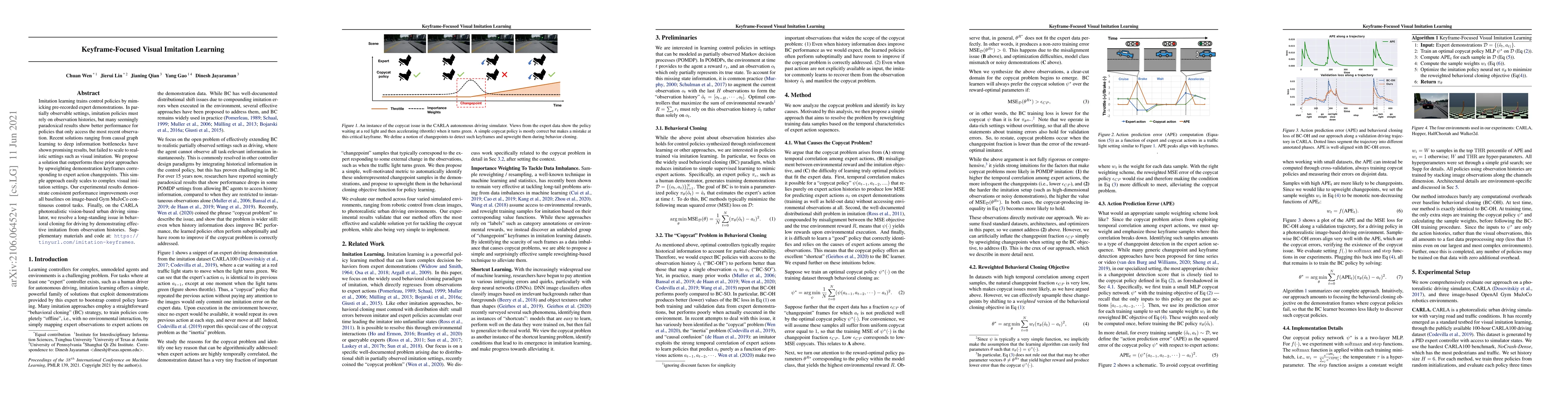 This paper proposes a method for visual imitation learning that focuses on keyframes corresponding to expert action changepoints, outperforming prior approaches in complex settings. Experimental results show consistent improvements on continuous control tasks and resolve issues in behavioral cloning for driving in the CARLA simulator.