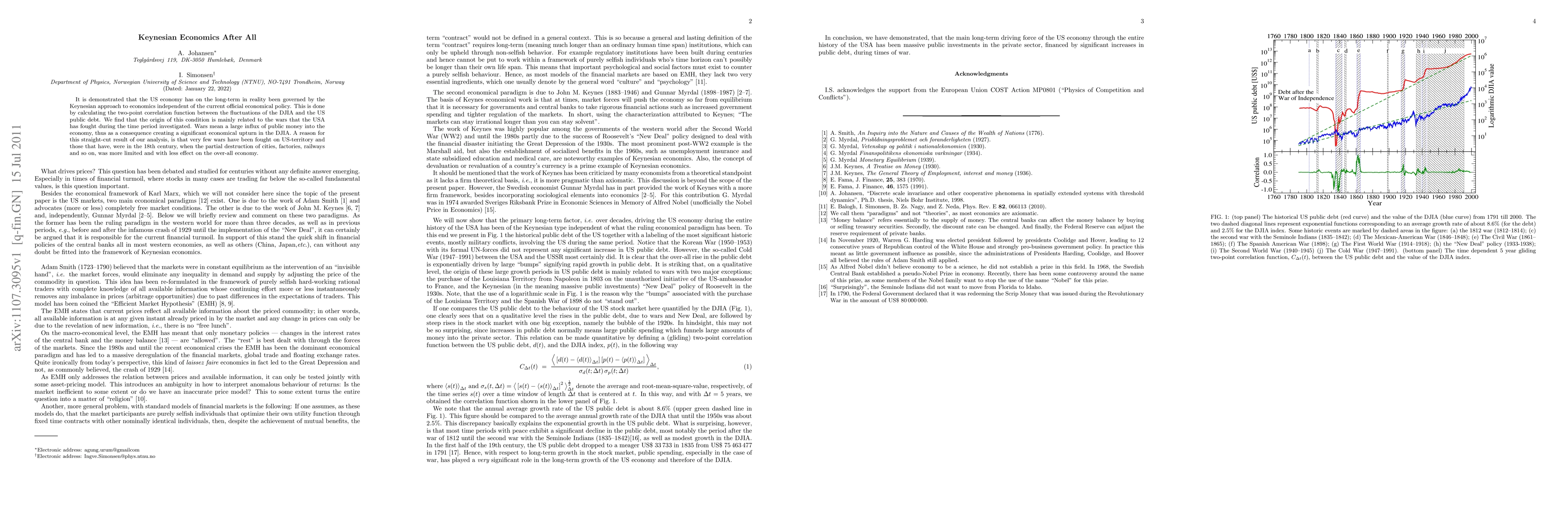 It is demonstrated that the US economy has on the long-term in reality been governed by the Keynesian approach to economics independent of the current official economical policy. This is done by calculating the two-point correlation function between the fluctuations of the DJIA and the US public debt. We find that the origin of this condition is mainly related to the wars that the USA has fought during the time period investigated. Wars mean a large influx of public money into the economy, thus as a consequence creating a significant economical upturn in the DJIA. A reason for this straight-cut result of our analysis, is that very few wars have been fought on US-territory and those that have, were in the 18th century, when the partial destruction of cities, factories, railways and so on, was more limited and with less effect on the over-all economy.