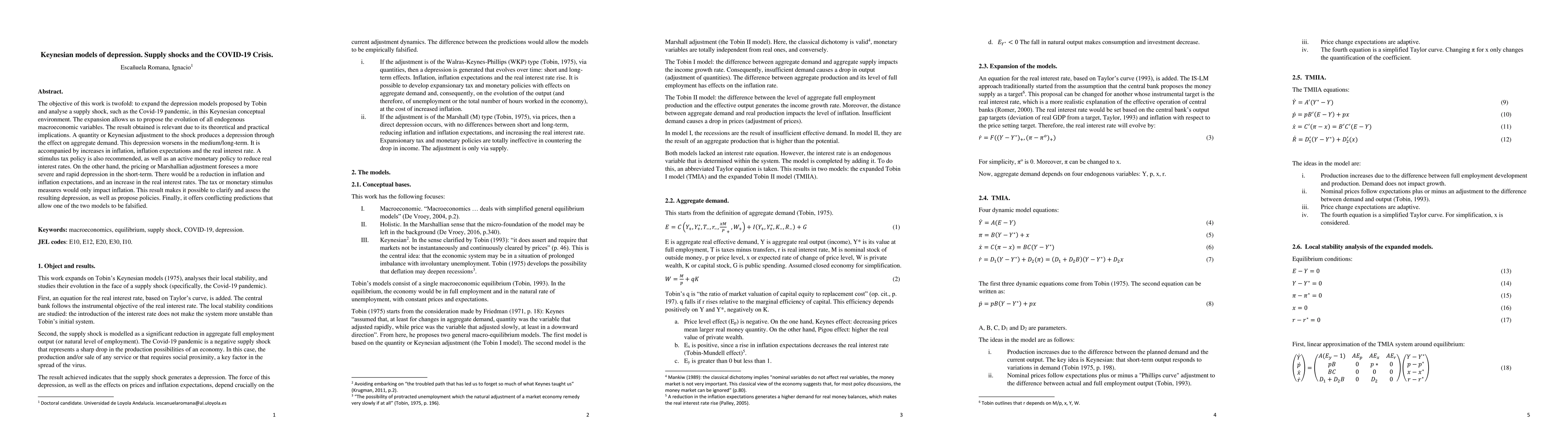 The objective of this work is twofold: to expand the depression models proposed by Tobin and analyse a supply shock, such as the Covid-19 pandemic, in this Keynesian conceptual environment. The expansion allows us to propose the evolution of all endogenous macroeconomic variables. The result obtained is relevant due to its theoretical and practical implications. A quantity or Keynesian adjustment to the shock produces a depression through the effect on aggregate demand. This depression worsens in the medium/long-term. It is accompanied by increases in inflation, inflation expectations and the real interest rate. A stimulus tax policy is also recommended, as well as an active monetary policy to reduce real interest rates. On the other hand, the pricing or Marshallian adjustment foresees a more severe and rapid depression in the short-term. There would be a reduction in inflation and inflation expectations, and an increase in the real interest rates. The tax or monetary stimulus measures would only impact inflation. This result makes it possible to clarify and assess the resulting depression, as well as propose policies. Finally, it offers conflicting predictions that allow one of the two models to be falsified.