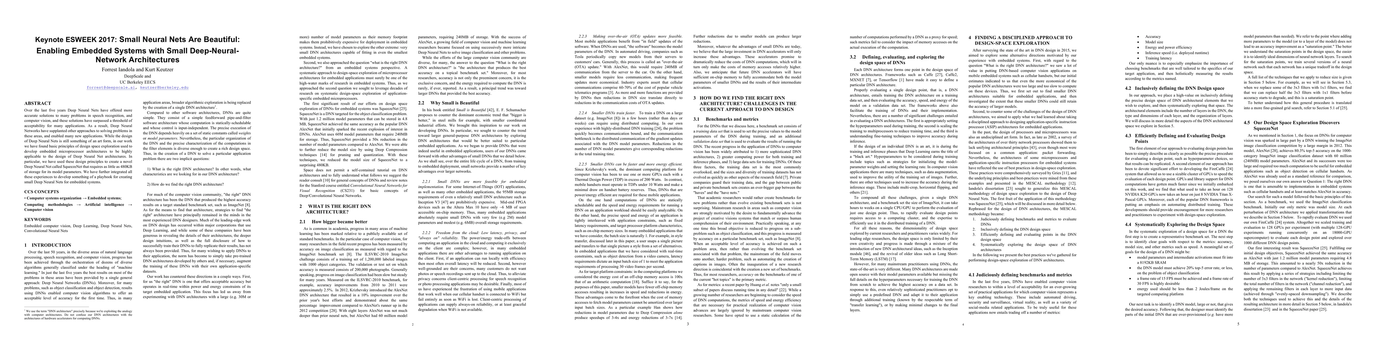 This paper discusses the development of SqueezeNet, a small deep neural network that requires minimal storage, showcasing how design principles from embedded microprocessor architectures can be applied to create efficient deep learning models. The authors present a playbook for designing such small neural networks suitable for embedded systems.