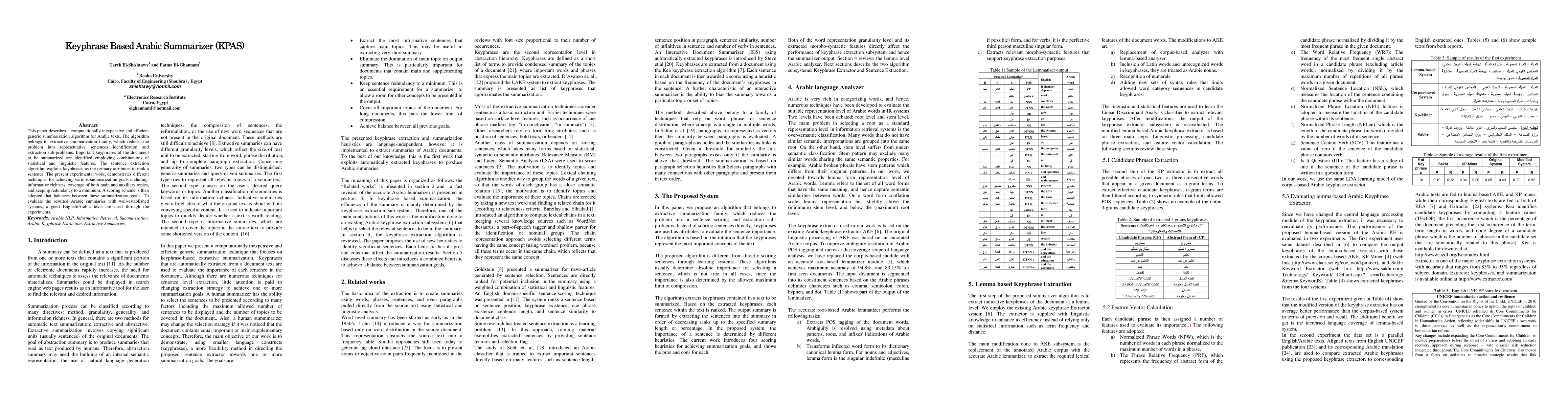 This paper describes a computationally inexpensive and efficient generic summarization algorithm for Arabic texts. The algorithm belongs to extractive summarization family, which reduces the problem into representative sentences identification and extraction sub-problems. Important keyphrases of the document to be summarized are identified employing combinations of statistical and linguistic features. The sentence extraction algorithm exploits keyphrases as the primary attributes to rank a sentence. The present experimental work, demonstrates different techniques for achieving various summarization goals including: informative richness, coverage of both main and auxiliary topics, and keeping redundancy to a minimum. A scoring scheme is then adopted that balances between these summarization goals. To evaluate the resulted Arabic summaries with well-established systems, aligned English/Arabic texts are used through the experiments.